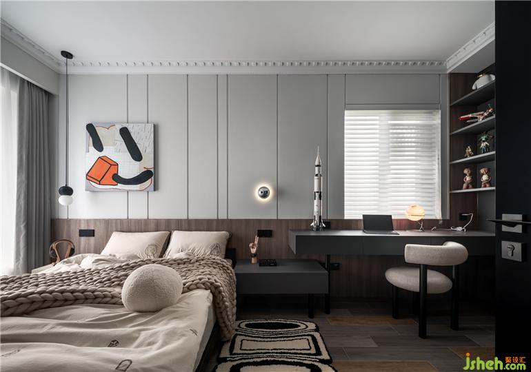 l 小孩房在布局上尽量预留更多的活动空间,所以衣帽间和卧室区域没有做分隔,只在靠墙的位置做了储物,让空间尽可能通透。