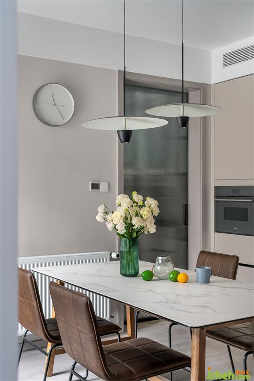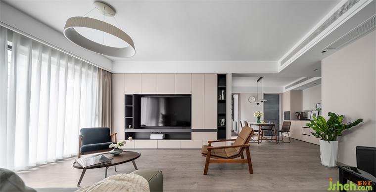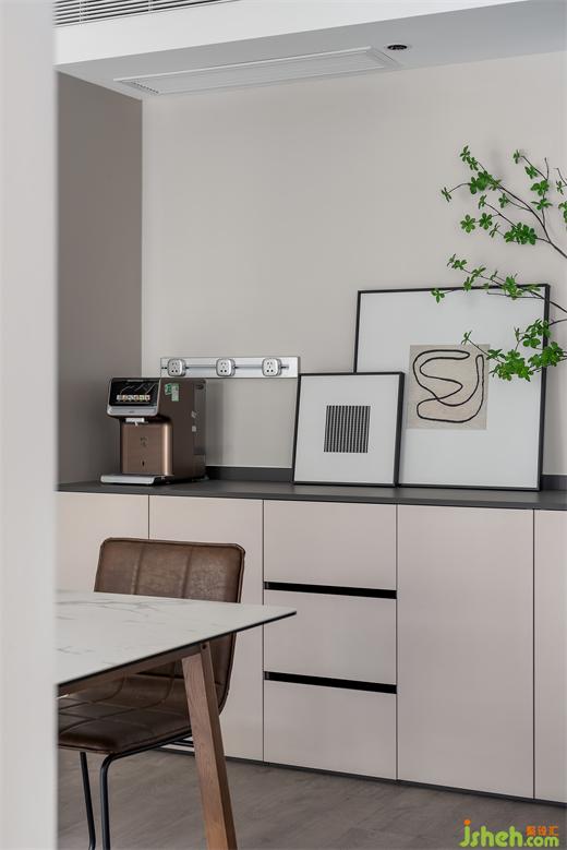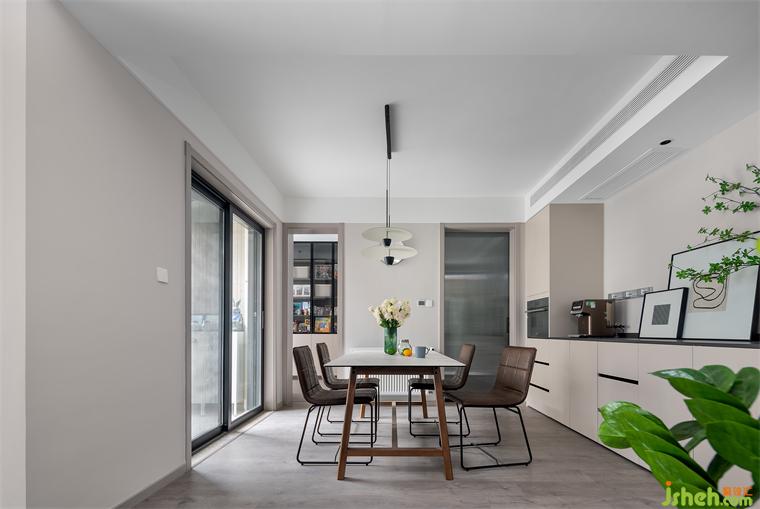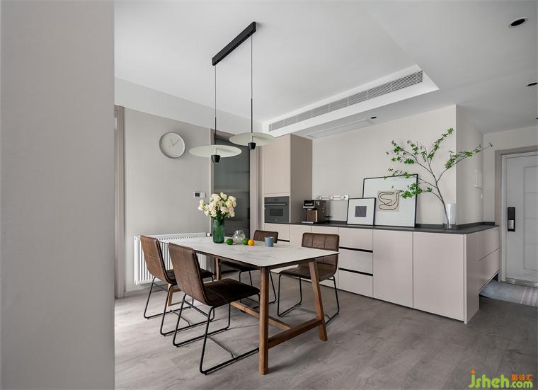 为了尽可能增加收纳空间,除了单独的储物间,隐藏式的收纳柜也随处可见,客餐厅一体化设计,让音乐和烟火相辅相融。