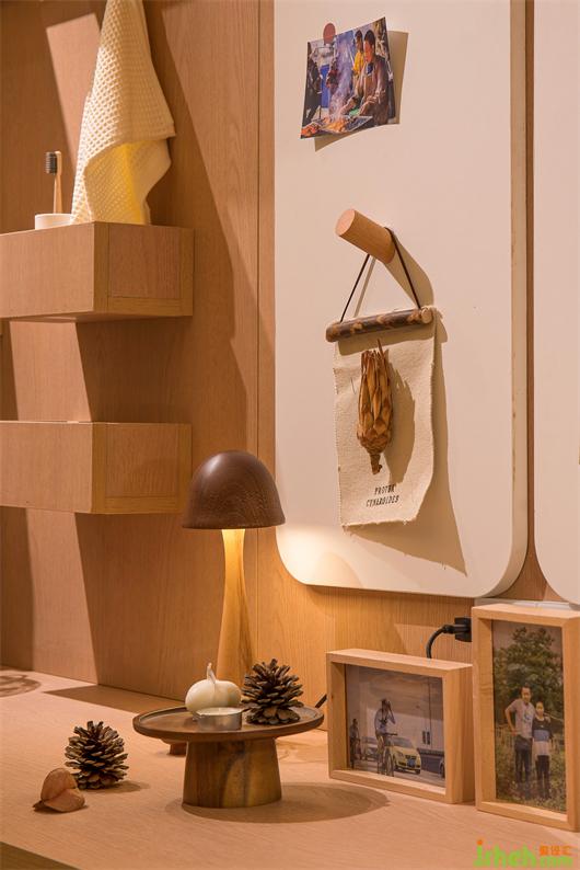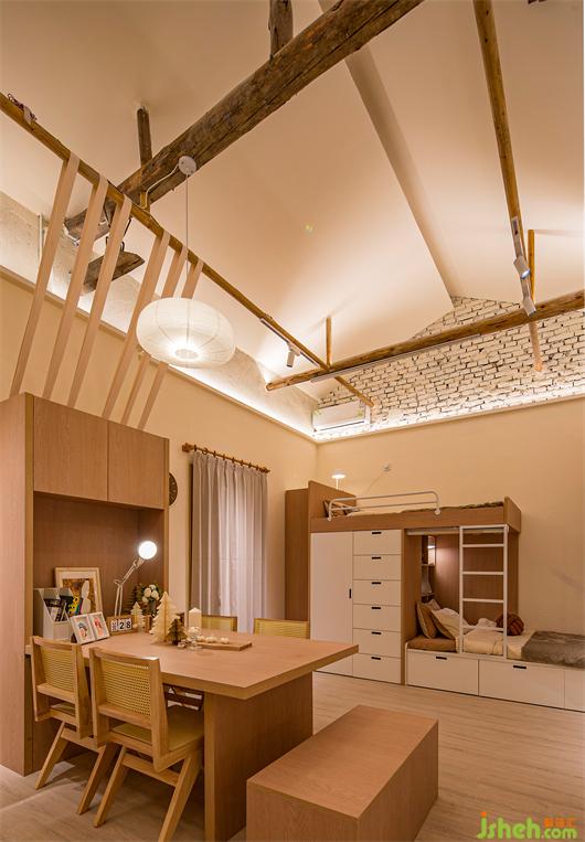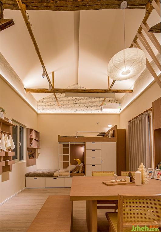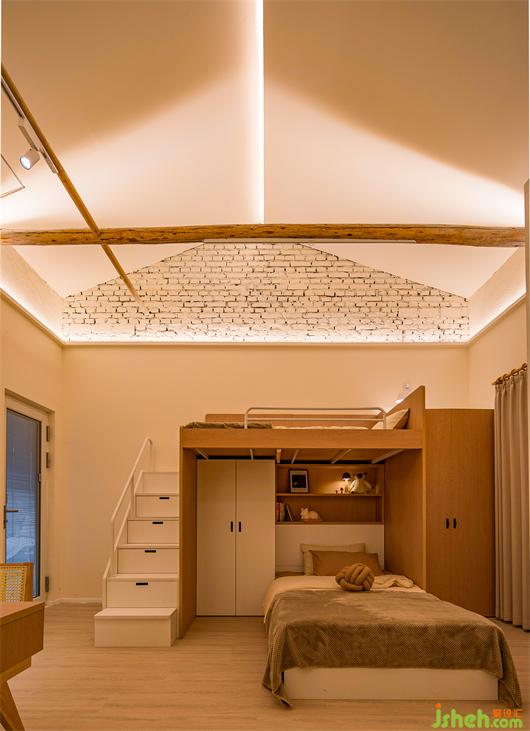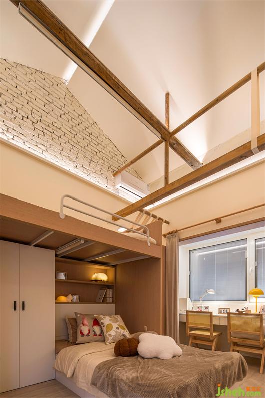 农场改造设计建筑在加固期间通过外扩飘窗的形式将采光量得以提升,百叶卷帘与玻璃夹层的设置有效控制室内光线与户外风景。居住墙面上特别设置一块“木质生活墙”,并划分为生活洗漱、运动器材、兴趣记忆、学习收纳四大主题板块,为孩子提供有序、整洁、清晰的收纳条件。