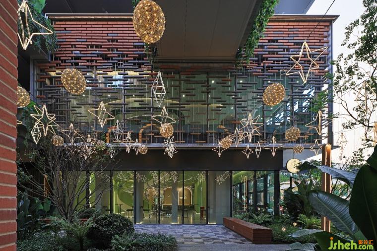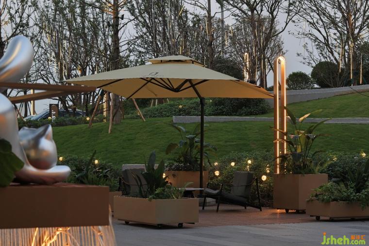 为了提升公共区域的整体氛围,宇合光年在灯光和景观软装方面力求打造一个舒适宜人的社区环境。在座椅组合上选择了定制单人沙发、桌子、遮阳伞等家具,搭配落地灯、草丛氛围灯、天幕等照明设备,营造出温馨舒适的休息空间。设计师们还特意加入了流水灯、情景雕塑等元素,使整个空间充满了自然和谐的氛围。