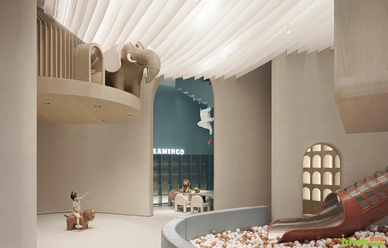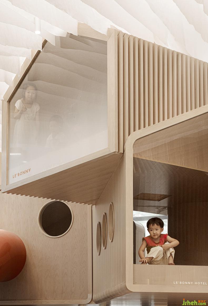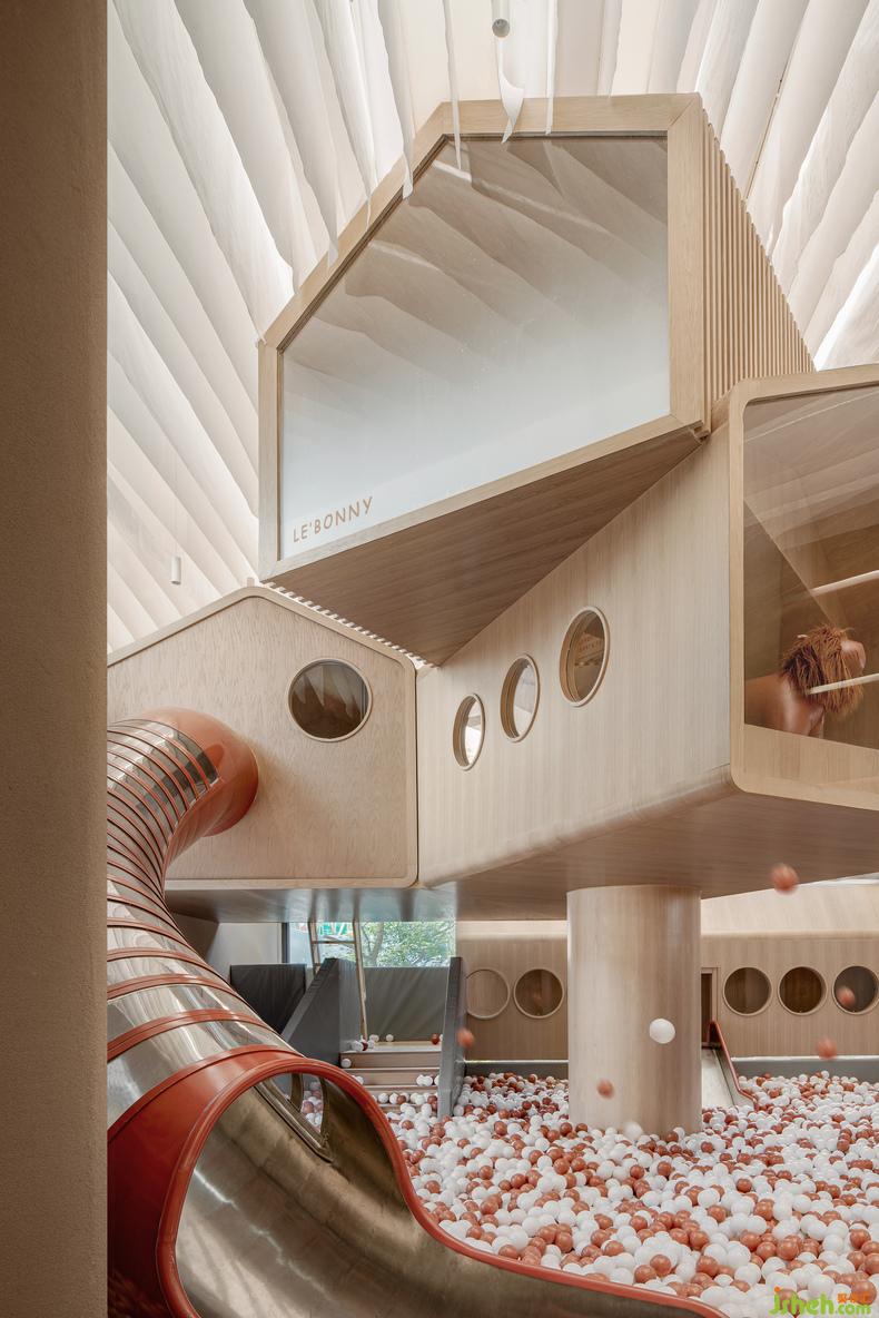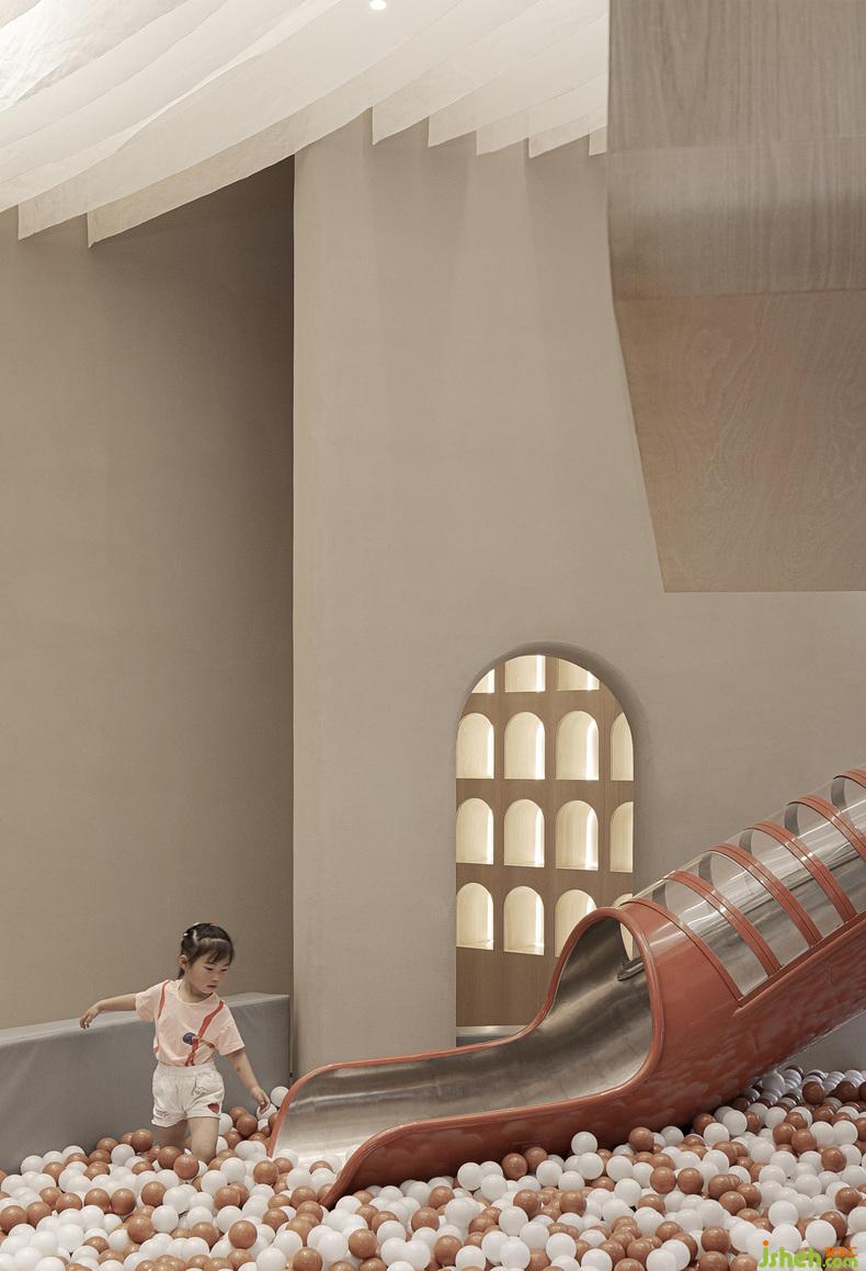 空间中考虑到各种不同形式儿童行为活动,希望在乐贝大堂空间内容纳更多的功能可能性,丰富活动乐园的使用性。当小朋友在泡泡池玩耍,攀爬区攀爬的时候,大人可以一起陪同冒险,也可以在休息区与木屋内的孩子挥手打招呼,室内设计师小朋友能感受到冒险的乐趣,同时也能感受到来自家人的陪伴,来自家人的爱意。