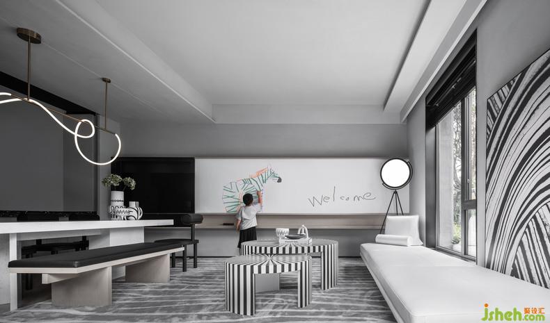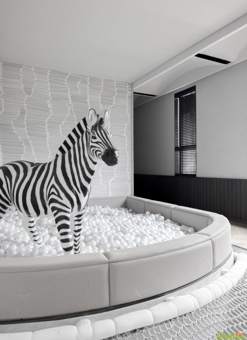斑马主题民宿以艺术的冒险为主题,斑马在媒体上一直是时尚的宠儿,设计团队由斑马时尚的条纹中提取灵感,室内设计师在空间中布置了涂鸦绘画板,攀爬网,泡泡池等亲子互动空间。特别适合艺术氛围的家庭入住,在这里,大人也可以是小孩子,也可以和孩子一起造梦,儿时稍在墙面画了一根线就会被骂的小孩成为了家长,带着自己的小孩来到斑马主题民宿,两人一起开心地在客厅画起了属于他们的故事。线条及块面的设计元素处理,无形中也是对孩子审美的提升。