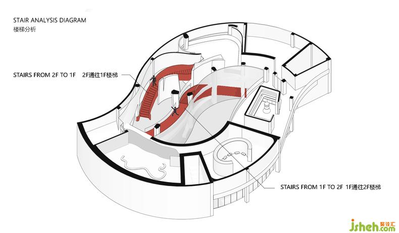 在生命之源性文化展馆的整个前厅造型设计上,设计团队通过两条曲面造型的楼梯贯穿整个前厅,文化展馆设计一条蜿蜒向上,一条顺延向下,两条楼梯于前厅视角中交织在一起,正寓意着两性中男性与女性角色。他们相互独立,却又相互平等,两者相望。
