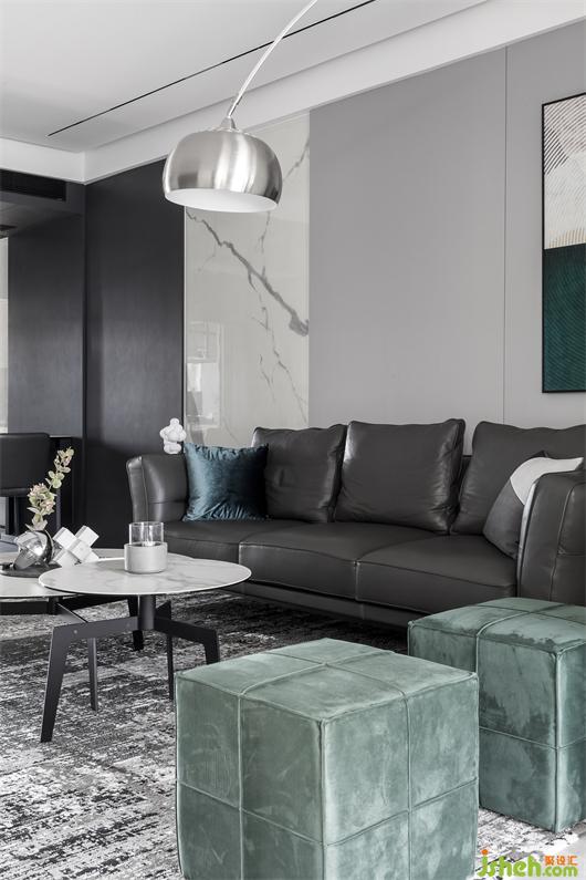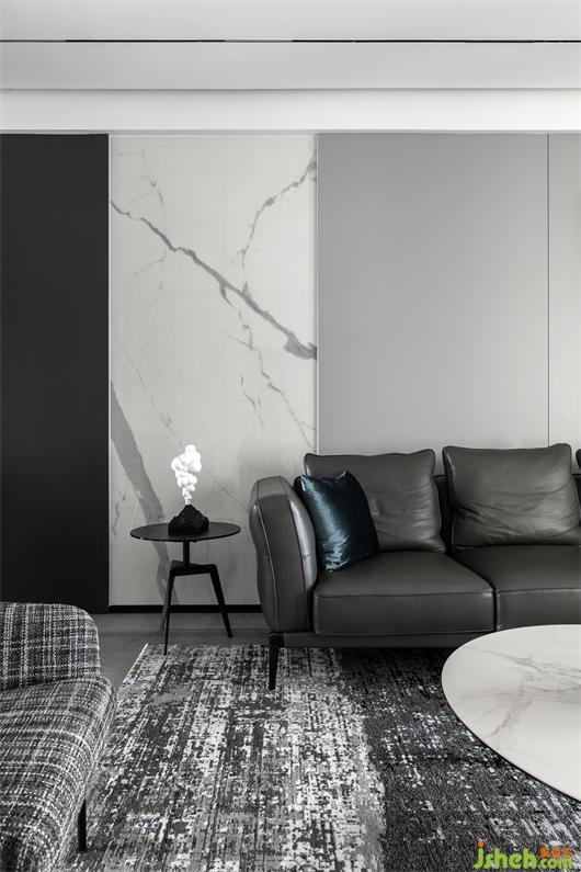 空间由三个维度构成,高度,长度,宽度;人们对于高度的敏感度是最大的,高度多10公分与长度多10公分的空间体验感差异极大,因此对于空间开阔的追求离不开高且平的吊顶空间设计,我尽可能将全屋的吊顶空间拉高且简化,来增加空间的开阔度.家居设计顶面采用了平吊顶无主灯的设计,线状磁吸灯和无边框的空调风口很呼应整体的感觉,在背景墙上增加了一幅挂画,使得原来深灰色的背景墙显得不那么单调。材质颜色上面使用了深灰色的护墙板,中灰的皮沙发还有地毯,黑色岩板的电视柜,角几和单人椅子加上华尔思音响。通过多处岩板过渡,使得整个空间显得非常有层次感和高级感。