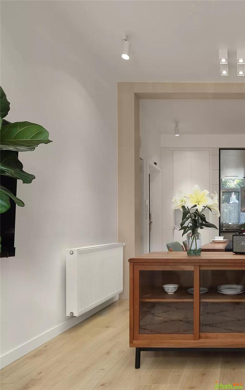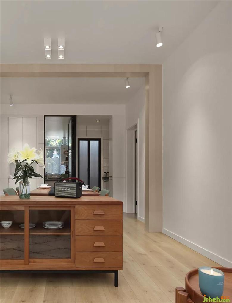 首先格局划分和业主沟通后确定只需要两个卧室加个书房,其次是把卫生间做干湿分开,把其中一个卧室门封闭做台盆柜,次卧和书房做成一个套间,方便孩子学习。最后是厨房门口部分墙体做储物,另外一边和卫生间共用的墙体打开做成玻璃隔断和厨房的玻璃门连起来形成通透的视觉,这样做的效果就是不管是厨房还是卫生间干区体验感都非常开阔,也把餐客厅的空间感延伸了。