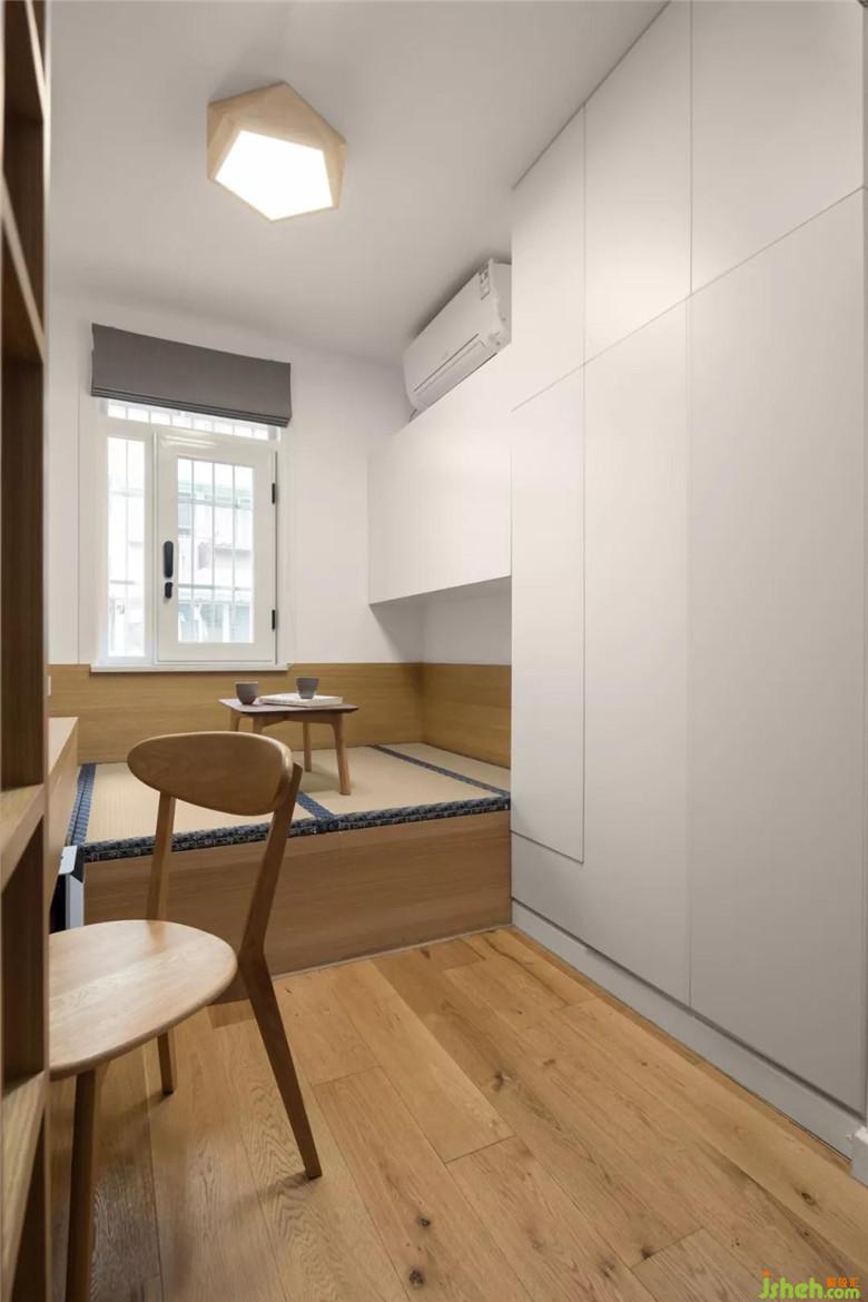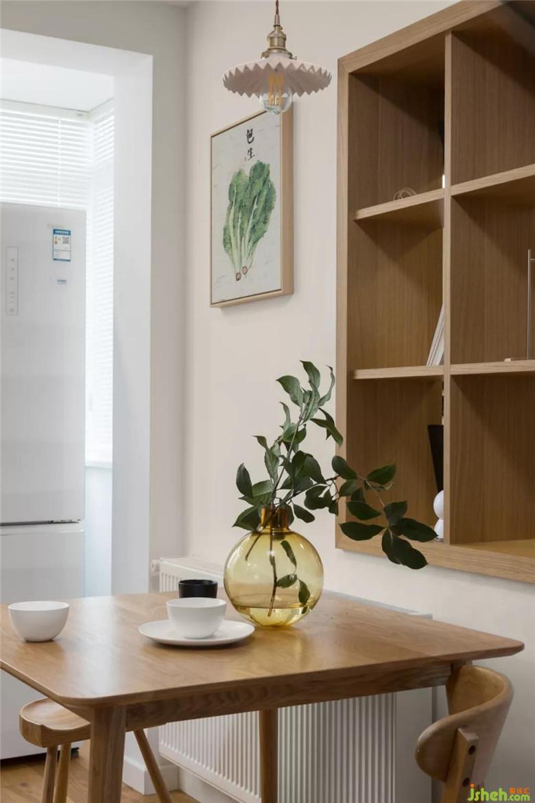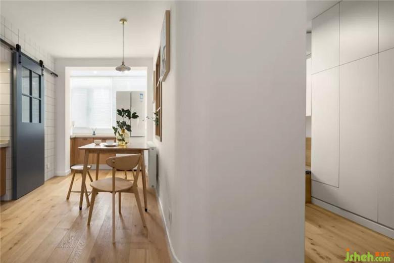 本案属于典型的“老破小”,户型特点就是房间大厅小,进门处也很狭窄,拿到案子后根据老房子的楼板走向特点对格局进行了局部调整。最小的房间把靠近门厅的墙体拆掉大部分做了鞋柜,这样进门就有了储物空间,门厅处也不会那么拥挤,另外一边做的榻榻米和写字台,平时是家人休息的地方,和餐厅之间的墙面做了个隔板装饰架,两个空间有了沟通的渠道。另一方面设计师从人性化角度考虑到这是个两孩家庭,且孩子都比较小,就把餐厅和过道之间的拐角做成了圆弧状,空间更加流畅且对于孩子也是一种保护。