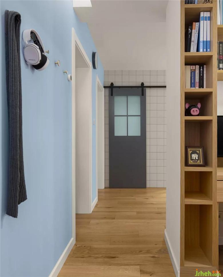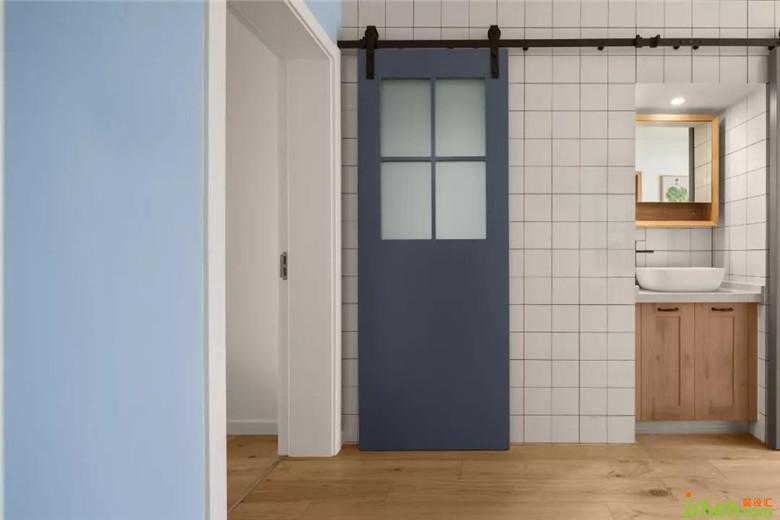 从门厅朝里看是卫生间门的谷仓门,在现有格局没办法改动的情况下就从美观上来做调整,半截玻璃的灰色谷仓门进门看到的会是一道风景。