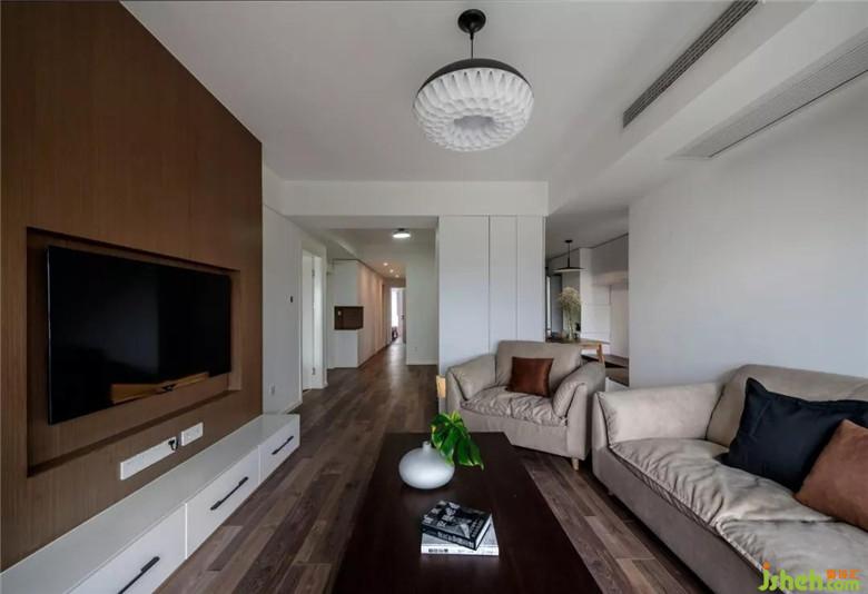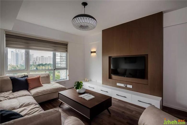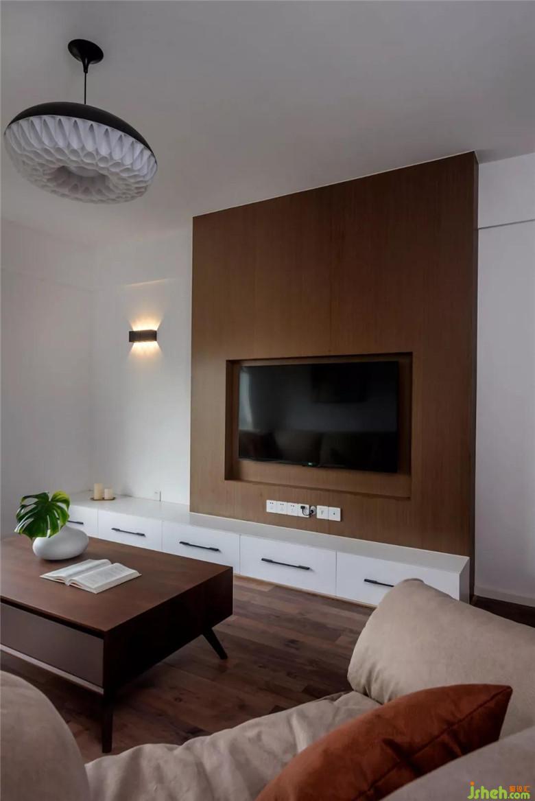 客厅和次卧公用的墙体拆掉做成了书柜,客厅这面自然形成了一个突出面挂电视,增加了空间的层次。这样做既实用又美观。