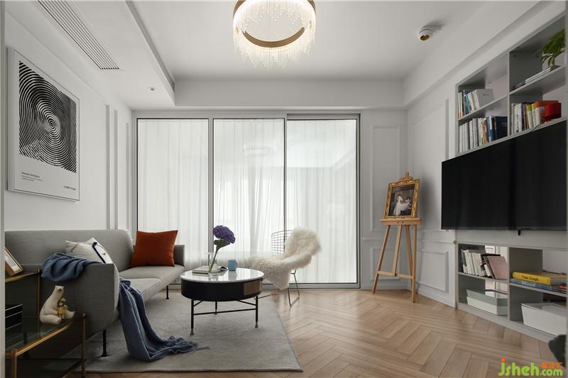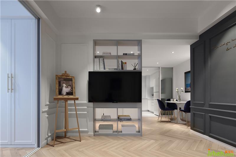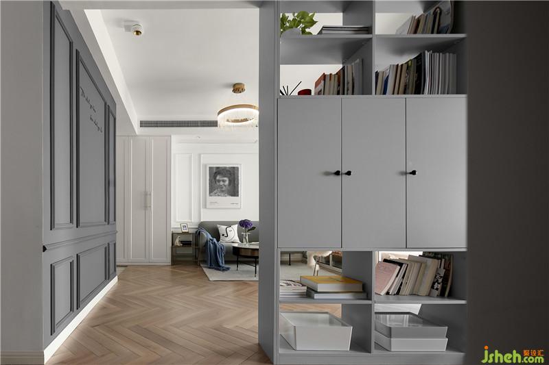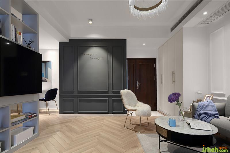 ▲客厅重新划分后用透明玻璃隔断分隔,不影响采光,一层白纱若影若现。人字拼地板更加精致,灰色的镂空书柜增加了空间层次。顶面的金色水晶吊灯款式高雅不俗。
