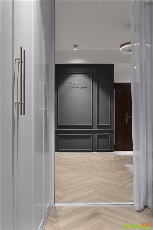 ▲从书房看向客厅及门厅,白纱的柔美遇到冷静的深灰色碰撞出知性的美。