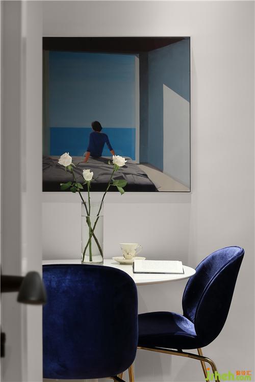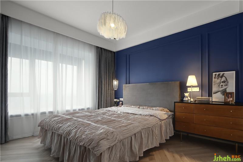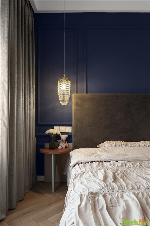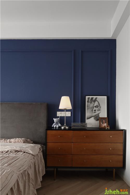 ▲在卧室里,裸粉色褶皱床品在钴蓝色墙面的映衬下散发出柔和的光芒。灰色的天鹅绒窗帘呼应着软包床,在质感上保持一致,并带有一丝奢华感。南京公寓装修设计搭配棕红色的斗柜又透露出一丝雅痞的味道,中和了裸粉色的柔美。