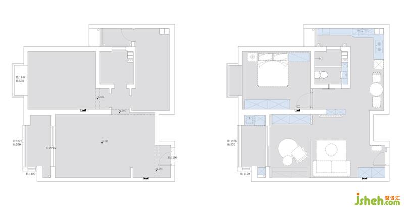 原始户型图规划极不合理,一室一厅。厨房细长带转角,且出门挨着卫生间门口也不太雅观,而且对于86平米做一室一厅是有些些的奢侈。