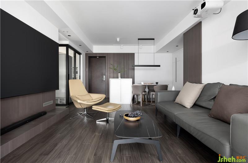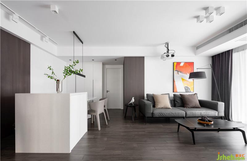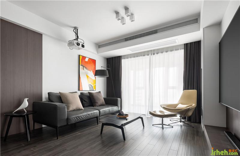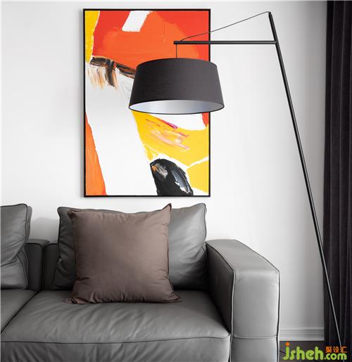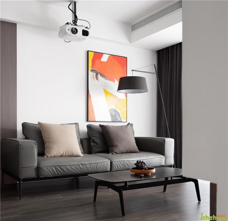 ▲冷灰色的皮质沙发搭配黑色岩板茶几,点缀一副红色挂画,尽显冷艳!