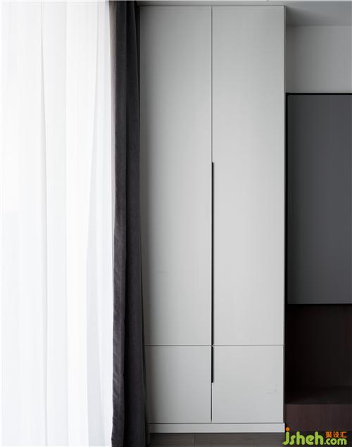 ▲主卧和儿卧之间的小过道使用频繁,阳角处做木饰面处理更耐用,南京装修设计主卧门做隐形门形成一个整体。