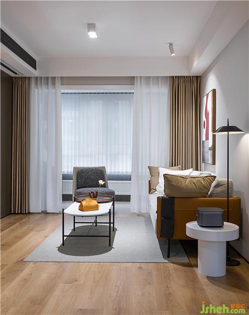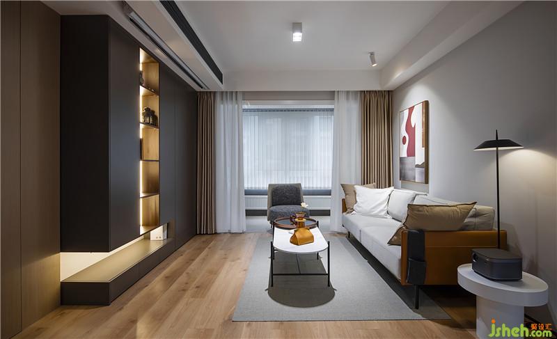 ▲舍弃传统电视墙,取而代之以幕布和投影实现观影需求。但更重要的是释放空间,满足阅读和收纳的需要。