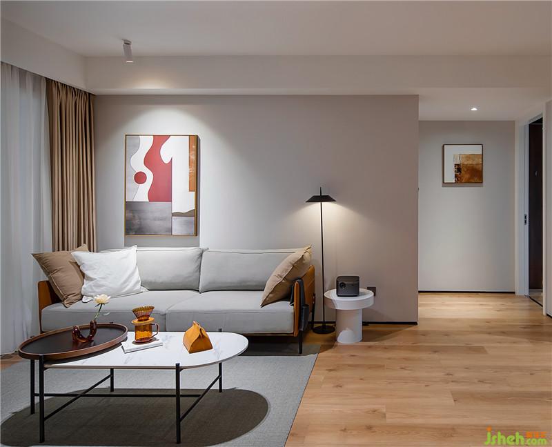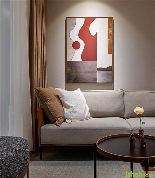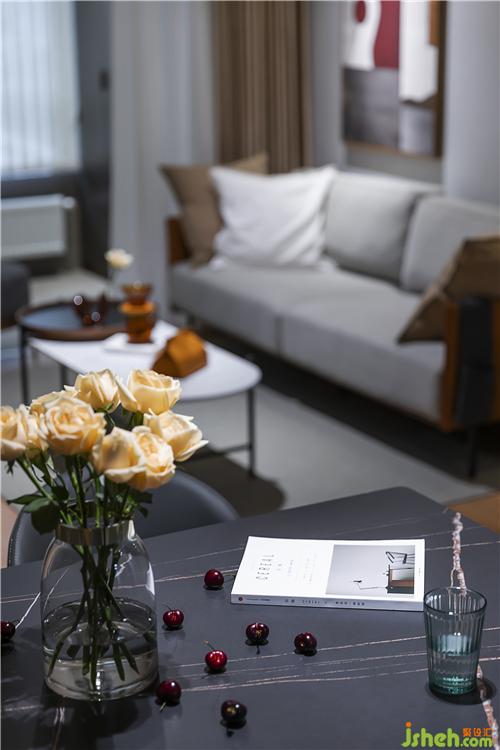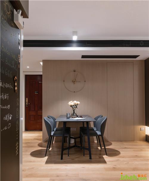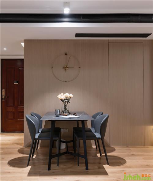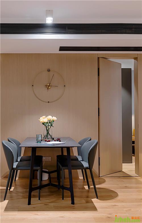 ▲劳伦黑金岩板餐桌,配以灰色真皮餐椅,稳重精致。整面的KD板,再内嵌隐形门,保持客厅的整体性和完整度。KD板细腻的纹理,天然成为西班牙钟的钟面,不着数字的表盘,让人领会时间中的留白南京室内设计师。