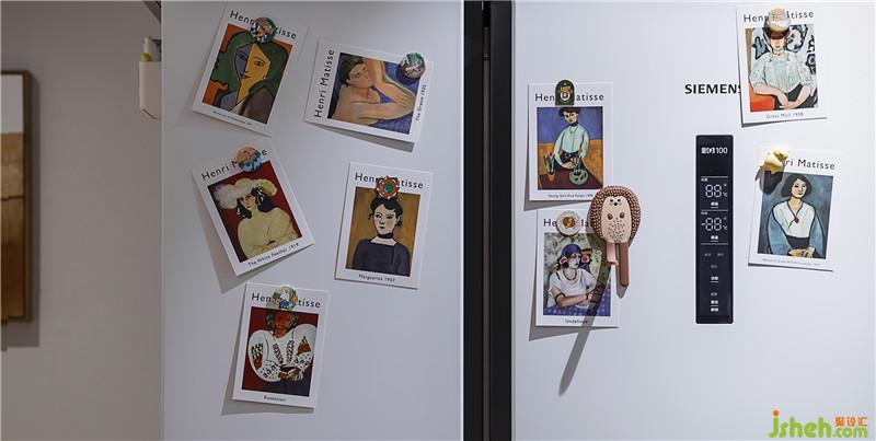 ▲次卧冰箱门上也贴满了我们从国外带回来的‘野兽派’的画作,和设计师找的画不谋而合,心有灵犀啊,哈哈哈。