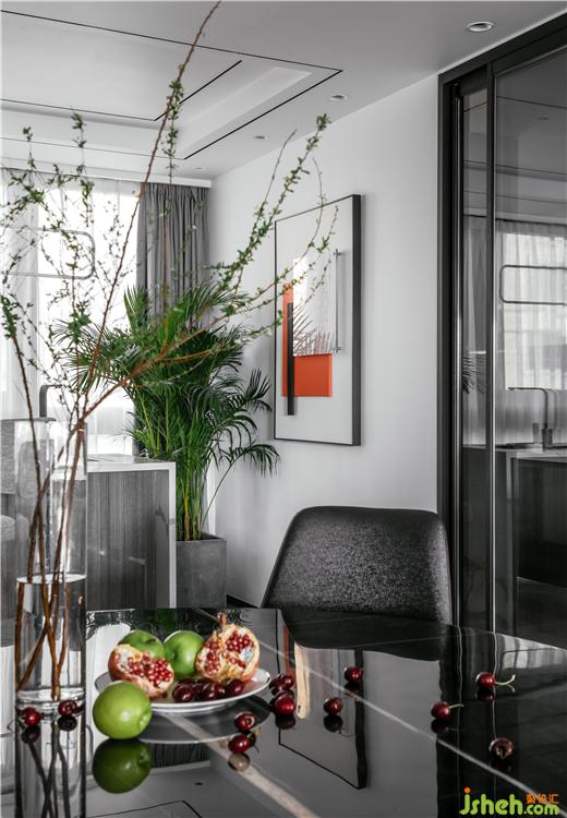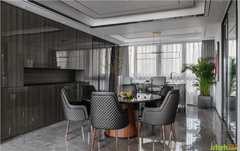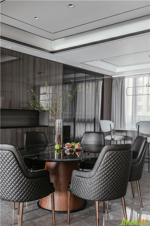 圆形黑色大理石餐台和方形黑色不锈钢天花造型呼应着,也找寻着“圆”、“方”基础美学的平衡。装修设计