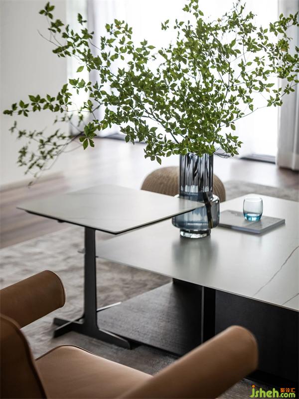 客、餐厅位于空间格局的核心,与国人住宅中的待客之厅相呼应。用半隔断的电视墙分割了空间去增添空间节奏。流畅的布局和舒适的尺度来完成家人间的交流互动,同时也为日常的社交活动提供了恰到好处的生活场景。
