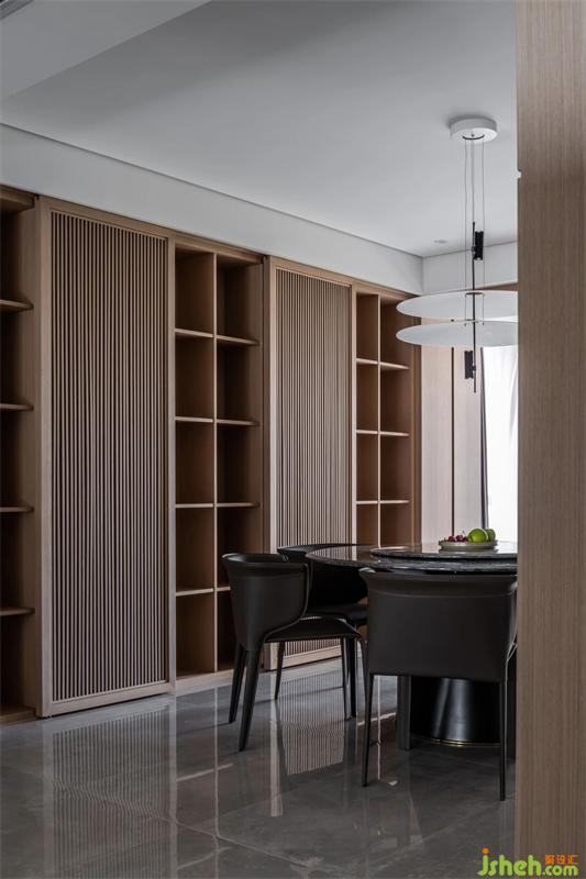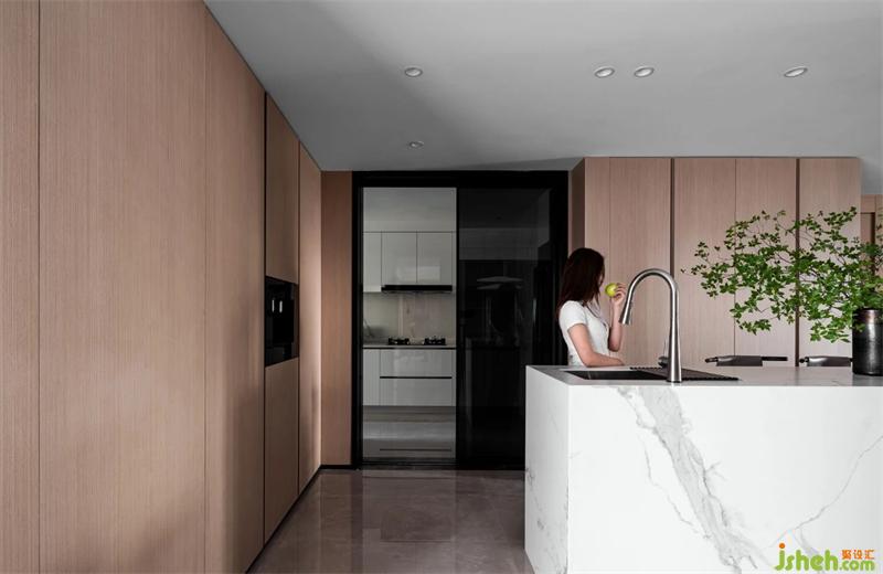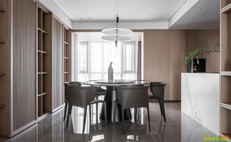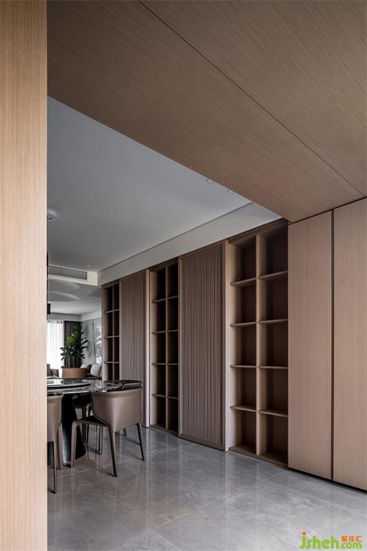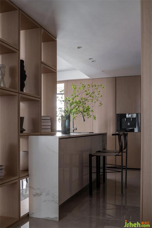 惠州豪宅设计轻盈的木色与沉稳的鱼肚白岩板联结是居者气质的体现,现代与自然的空间曲调在其中温柔延展。