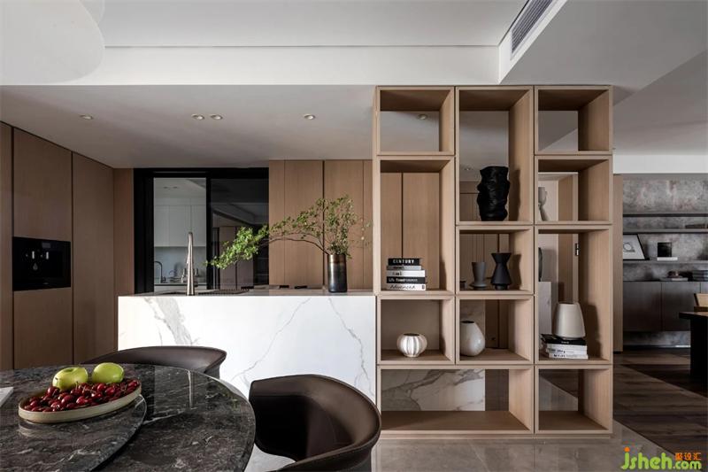 惠州豪宅设计入户进来半透的隔断和西吧连结,它不止是空间格局、吧台区和客餐厅之间的连接,同时委婉保护了空间的隐私。