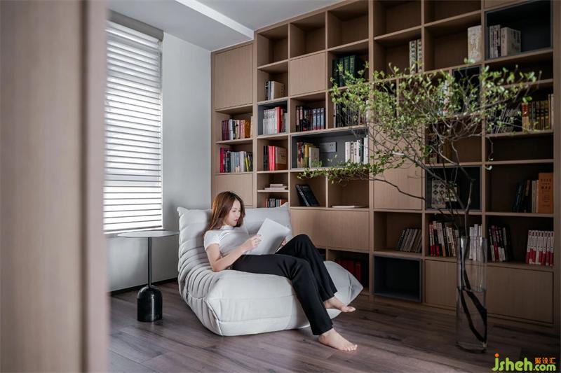 这个空间物主把所有喜欢的书籍都摆了上来,来自不同时期的书籍。这些“时间记忆”而延伸至空间,使生活空间内部描绘出具有情感温度的图像。