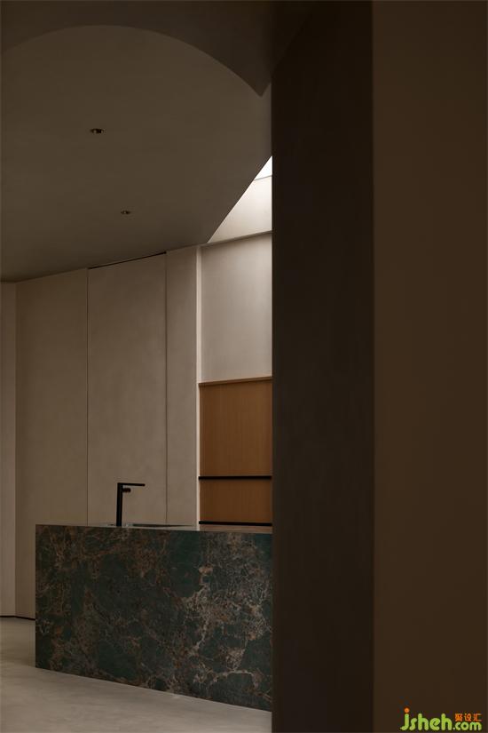 开放西厨吧和餐厅的形体组合,展示了不同群体的居住生活方式,也满足日常的访客接待,硬朗的坚硬台面与餐桌的通透形成了材料、质感、肌理之间的巧妙冲突。展厅设计作为空间里唯一垂挂的餐厅吊灯,其仿生的有机形态利用空间“半扇形”的平面优势,成为各个视线聚集的焦点,即便从入口经过,同样出现半是朦胧的隐约身影。
