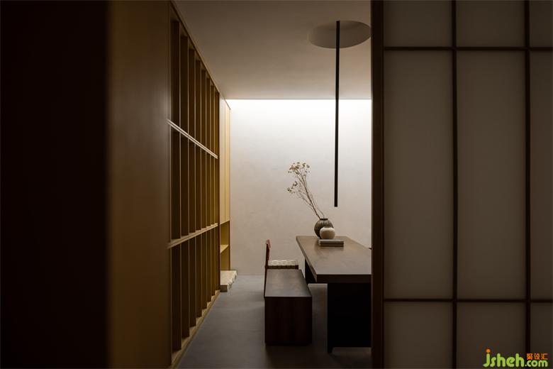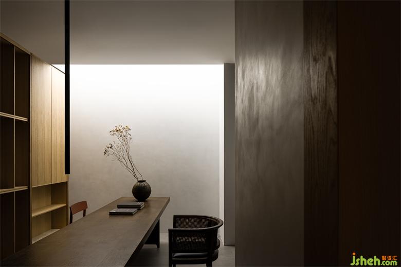 “闲寂与平衡”除了名词的表面含义,也表现于空间的氛围建构、材料的物质性神情以及婉约、含蓄、“隐而密”的审美趋势。在玛格演达店,阴翳与光相互交错叠加,于一片凝练的空间基底之中,感受细微的时间变化,明暗之间,色彩被削弱,材料的自然肌理、温润的质感被重新关注,最终,展厅设计以至空间的本来面目得以真实地呈现。