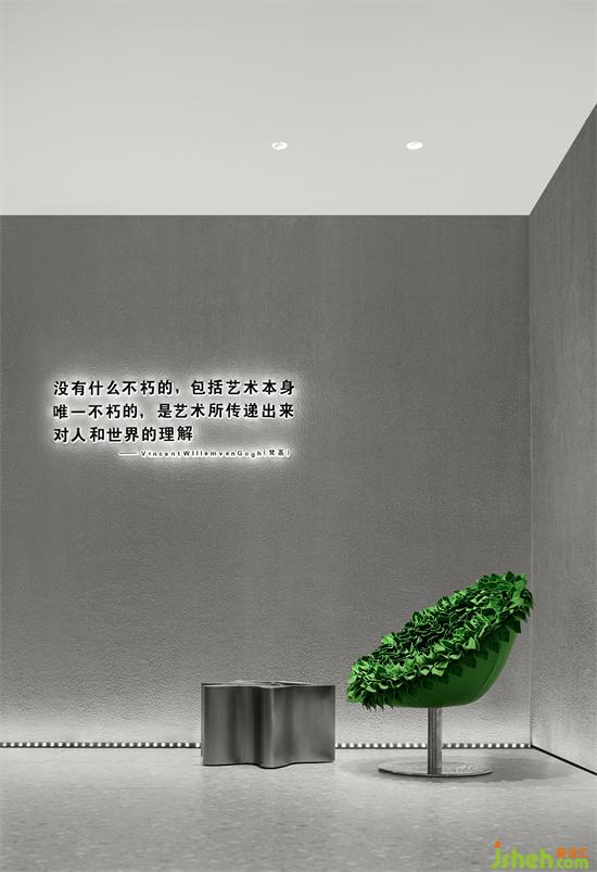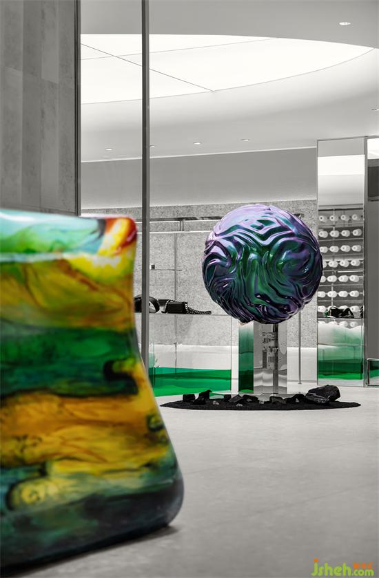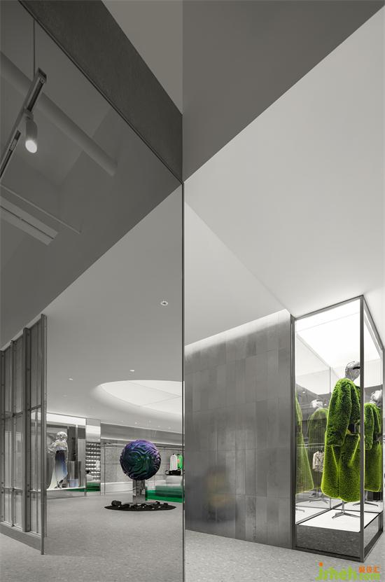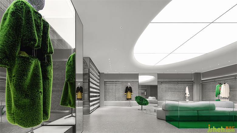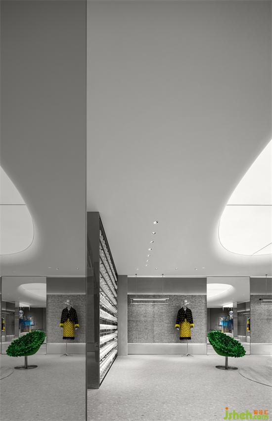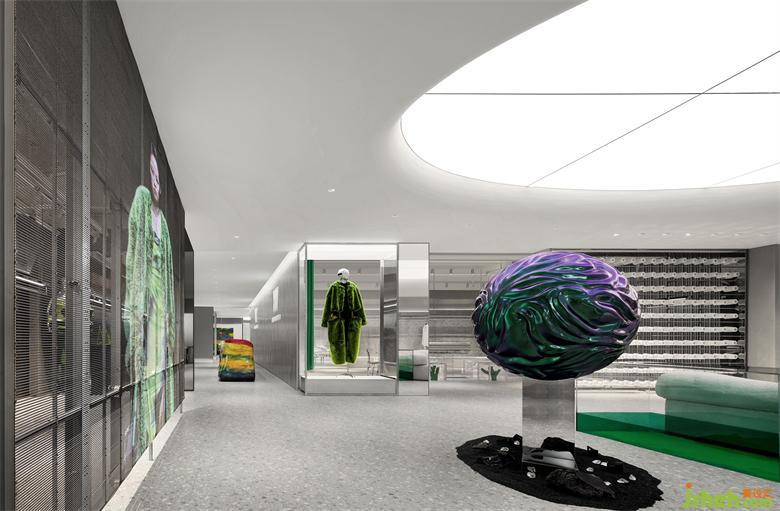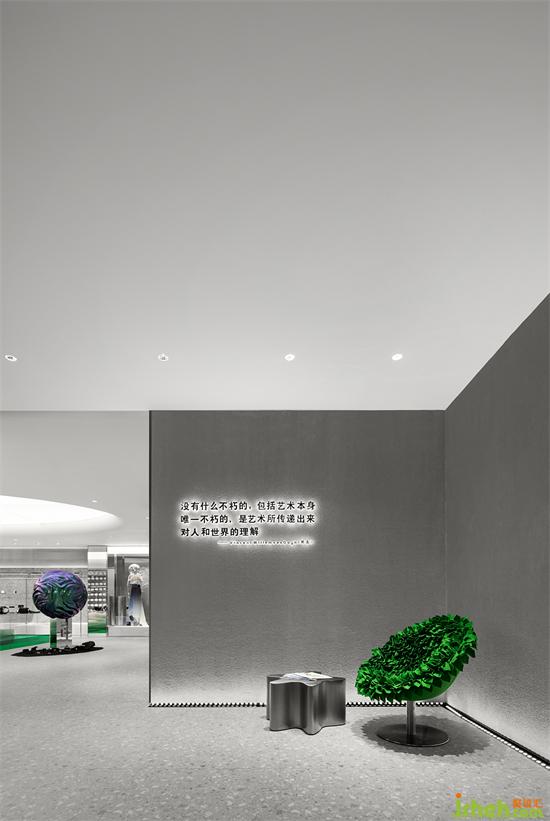 入口的地方是一个色彩斑斓的玻璃钢的前台,概念馆设计这个造型的设计是从大自然中的一幅画中提取的元素,炫彩系列也是YW品牌主打的款式之一,让布料的颜色在空间再次得到延续和生长,正所谓品牌概念馆的设计,我们更多的是传达品牌深层次的文化属性,让空间做为载体去演绎它。