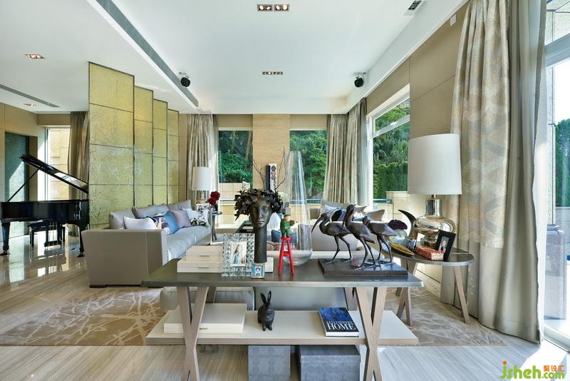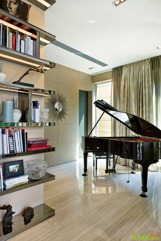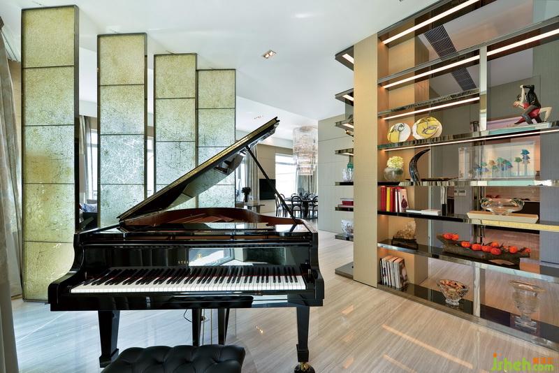 四扇黄绿色调带磨砂花纹的玻璃,却巧妙而温柔地隔断了客厅与偏厅。三角钢琴隐藏在偏厅之中,金棕配色完美融入了空间,更为一旁方正的博古架增添一丝动感与浪漫。