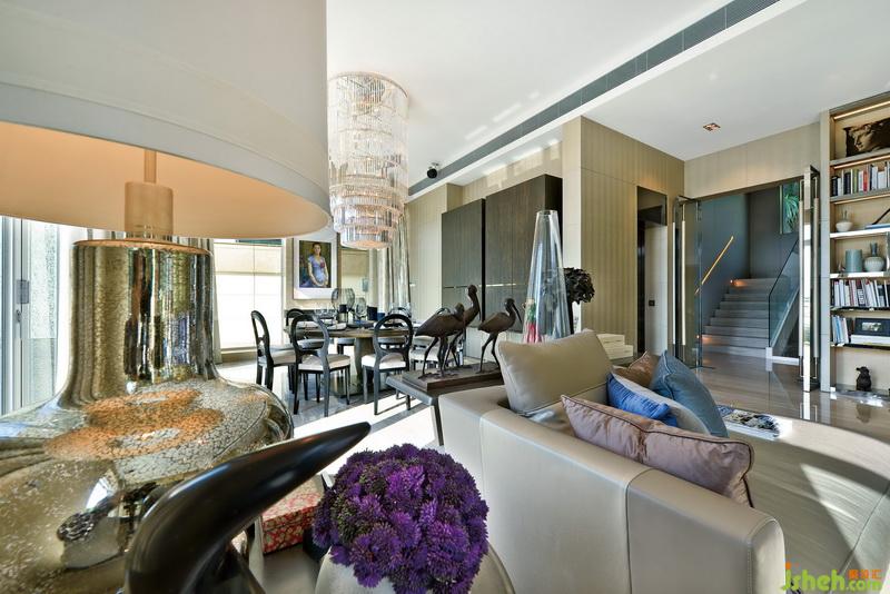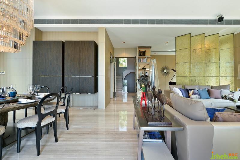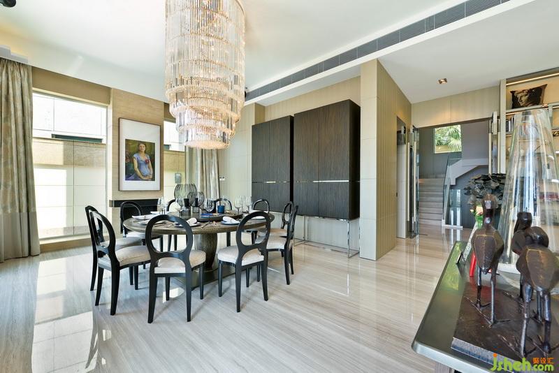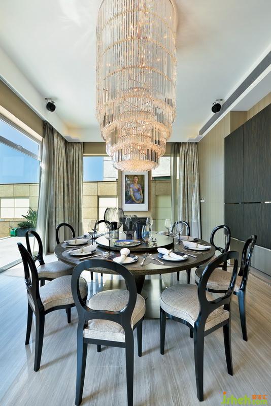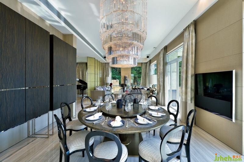 水晶吊灯垂落而下,光彩琉璃,构成餐厅的焦点。围合式的餐桌温馨家常,左侧是实用性极强的收纳立柜,右侧则为电视墙,万家灯火时,一家人其乐融融相聚在此,共享团圆之乐。