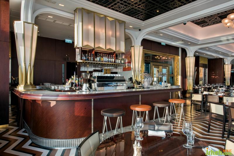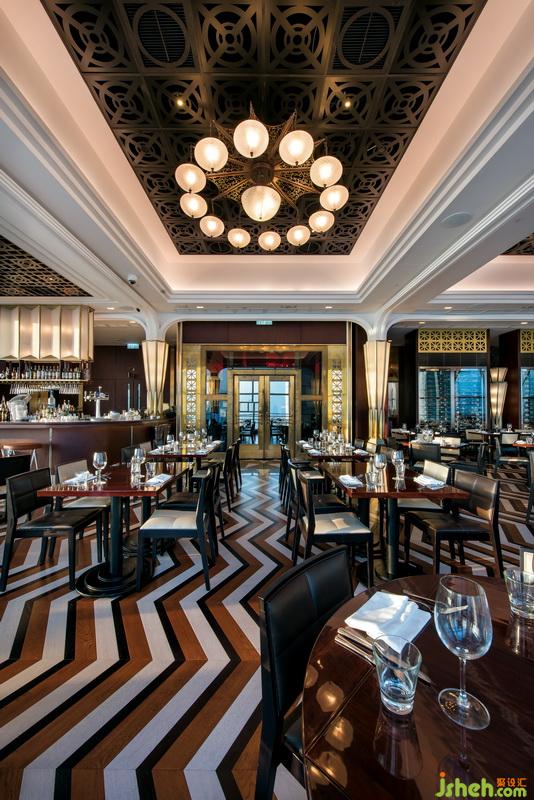 6,000呎的超大空间和落地窗的大面积使用,令空间平坦如镜,一览无余。就餐区的每一处细节,也将“装饰风艺术”贯彻到了极致。菱形沙漏状的落地灯精美得仿佛装置艺术,与吧台顶灯一脉相承的同时,又令玻璃酒盏笼罩在流光溢彩中。