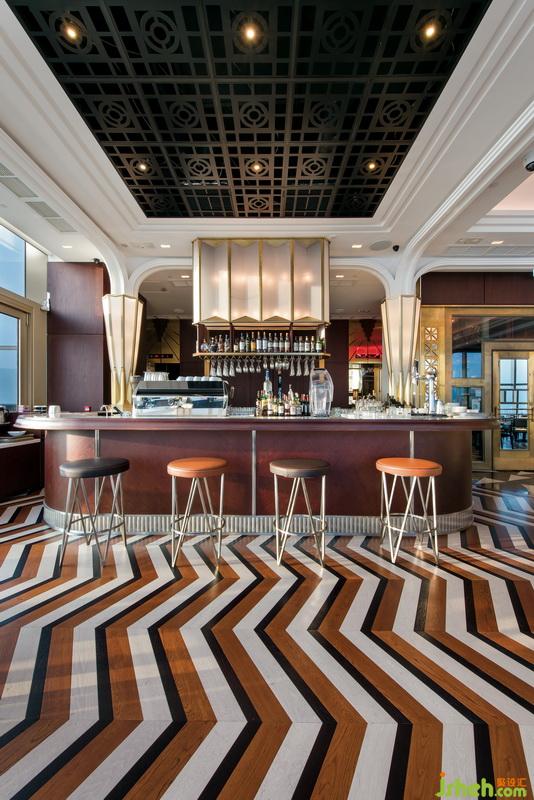 一向风格极简的室内设计师郑炳坤,在峰景酒店的设计配色却格外大胆:褐、黄、白配色的折线状线条地板,热烈得令人想伴随欢快的爵士乐尽情摇摆。而地板、高脚凳、吧台色调与款式整齐划一,流畅得仿佛浑然天成。换个角度,吧台便焕发了新精彩。酒柜上的水晶灯做工精巧细腻,中西结合,仿佛留声机浅吟低唱,港片里的黄金时代缓缓而来。