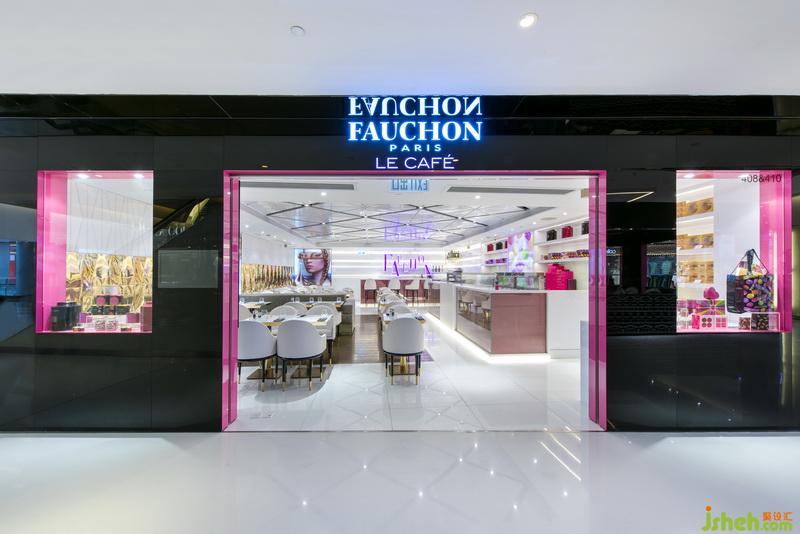 正门以品牌最经典的黑衬桃红作为主题,加上醒目的霓虹灯店名,凸显出个性时尚的品味,同时也强调了"Made in FAUCHON, Made in France",郑炳坤特意在两侧设计了透明橱窗,精致的甜品一定能抓住路人的眼球