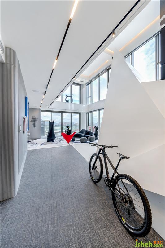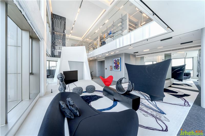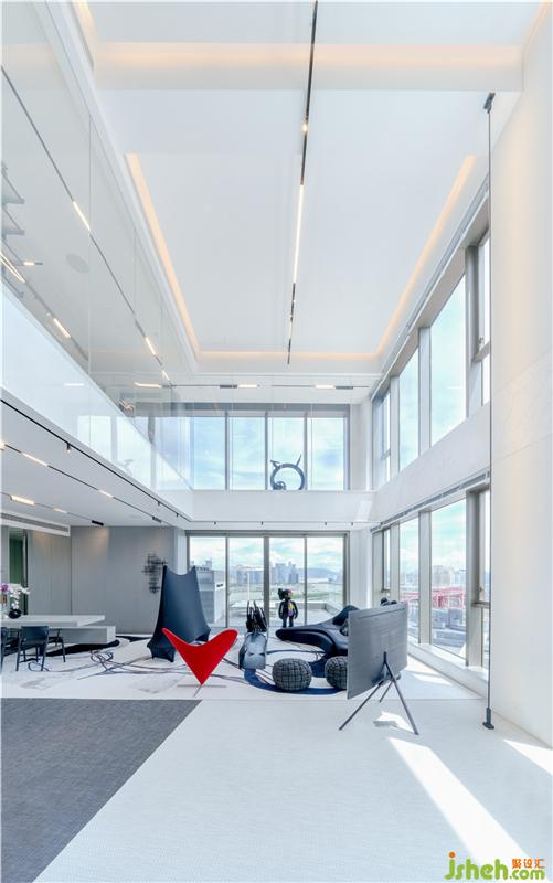 下层客厅以白色为主调,客厅为中空上下两层,以通透的全高玻璃分隔,一个黑色的流线形沙发,搭配不规则流线图案的地毯,而艷丽的红色座椅是其中一个亮点,让整个氛围变得不传统但有趣。