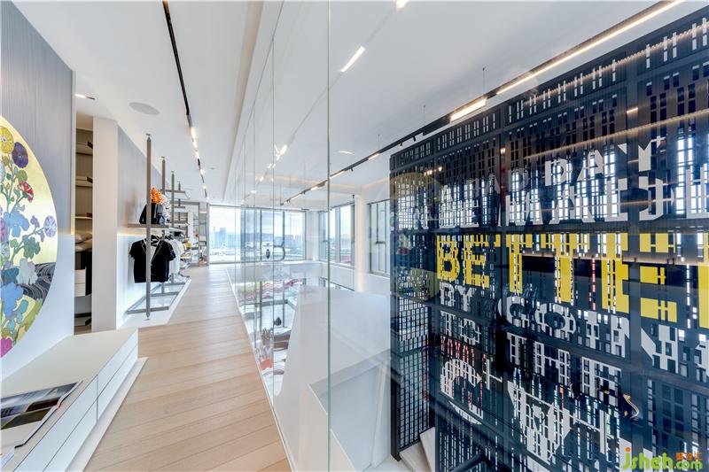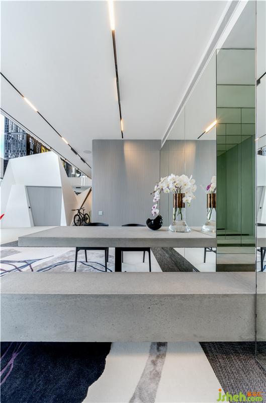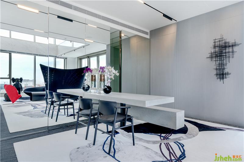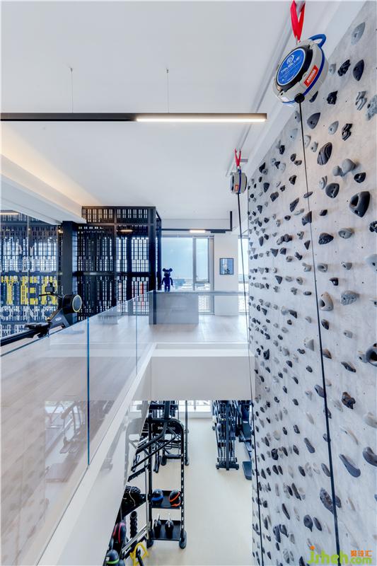 上层由两道自动感应的特大镜面趟门分隔出主人房及衣帽间。主人房内外都各设有一张吧台供户主使用。而主人房外的空间可透过全高玻璃墙身挑望到下层的客厅,由主人房到特大衣帽间会经过一条长直通透的玻璃走廊,亦可唤作艺术品的展览厅,当中特别设计了艺术品展示区,因为户主也是一个喜爱收集当代艺术品的收藏家。