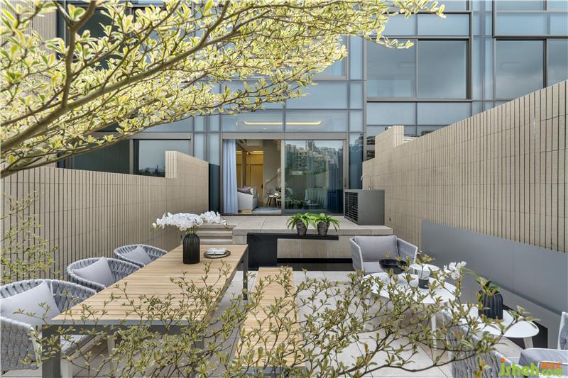 移步室外,这一片天地并非花园,而是庭院。三面围砌的木色砂岩院墙,硬质铺装的白色石灰地砖,以及庭院中部的下沉布局,让整个空间在结构上简洁利落、工整柔和,让镜面水池的落水叮咚与榄仁折枝的叶蔓斑驳对景呼应、淡雅交错,颇有旧时“堂下谓之庭”的古韵。试想,清明时节,深深庭院,与家人朋友欢聚一处,品茗、赏花、观鸟、迎春,恰是因应了“对浓绿阴中庭院,燕语莺啼”的美好意境。