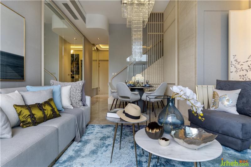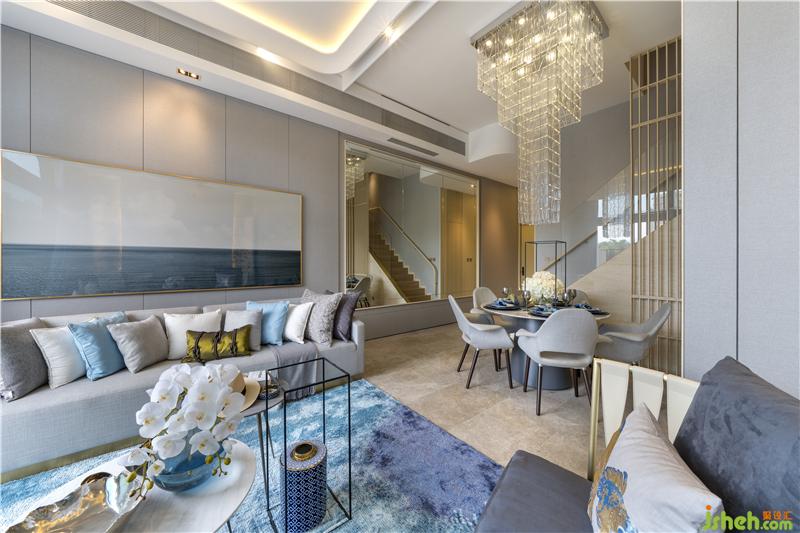 继续向前,中式原木镂空格栅将动区与通往静区的楼梯进行物理分割。转过身来,长达2米的水晶吊灯如水银泻地,既呼应了3米5挑高的尺度,让空间在维度上瞬间拉满;又借景户外,拉近房屋内外的亲密关系,让视觉在层次上极大丰富。客厅墙面整块的白色云石岩板与地面满铺的蓝色墨染地毯隔空呼应、各领风骚,在自然的石材纹理与手工的织物质感间勾勒出山的绵延和水的婉转。优雅拙朴的莫兰迪色系沙发,与黄铜桌脚、大理石台面的组合茶几合围布局,搭配金属质感强烈的艺术摆件,任由海天蓝白挂画的从中调和,在无主灯设计的氛围照明中,让日常生活从肌理处溢出高雅品味,并不忘加持一份于无声处的随性洒脱。