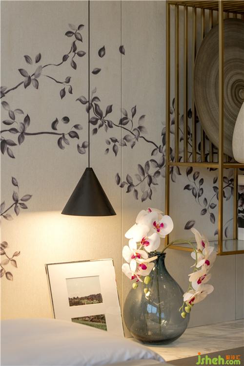 拾级漫步来到三楼,有限的45㎡空间之内,设计师采用大量的木作围身为屋主的起居活动划定边界、守好隐私,嵌套木围中的隐藏门扇为卧眠、盥洗和起居空间保持相对独立的功能分区。香港别墅装饰进入主卧,180°全景玻璃幕墙既让整个房间的光线无比通透,也让屋外景观的自然生机尽收眼底。隔空悬挂于背墙之上的黄铜格架将器物的实用之美与工艺之美合二为一、藏秀并举,与贵妃榻旁、颇具古韵的鸟笼产生了器型、纹理、色彩、温度的交融浸染、相映成趣。房间内蓝色墨染的地毯与花木折枝的墙饰与其他起居空间的中式元素协调一致、古韵朴拙。