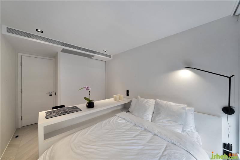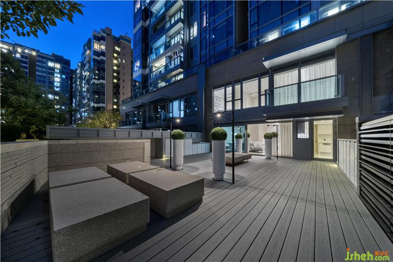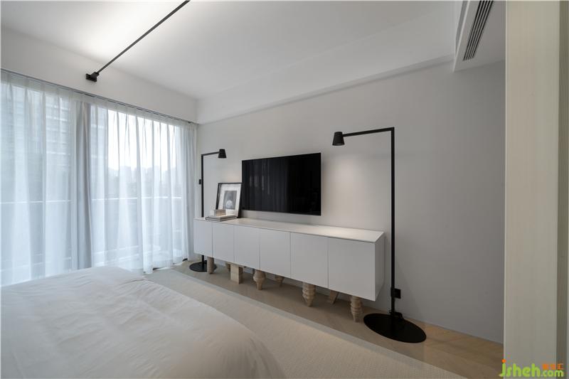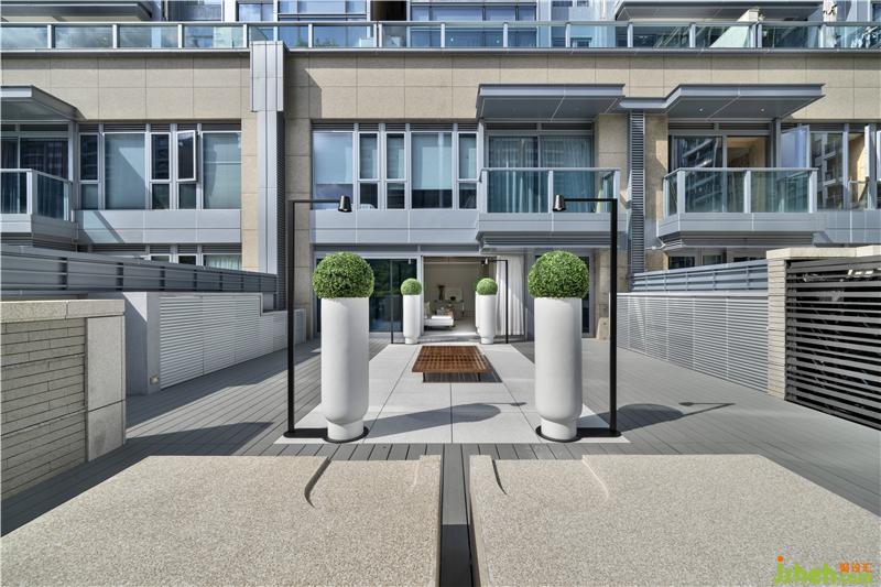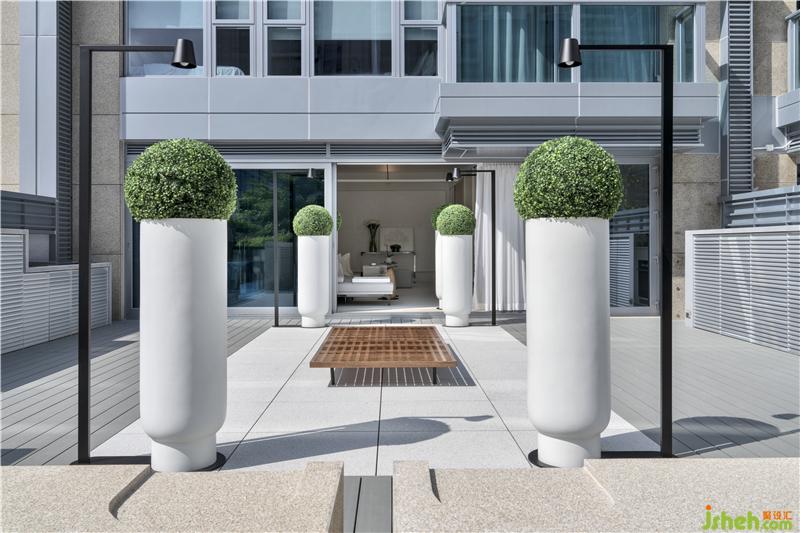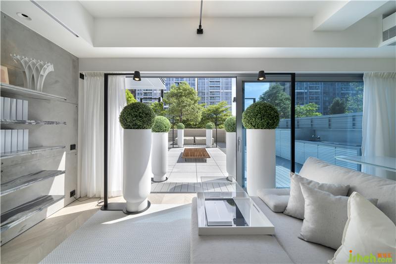 户外光源设置同样突显设计巧思,六根Bodoni字体C形灯柱,为庭院的中轴景观镶上哑黑边框,在一片素白底色中裁剪出立体感。