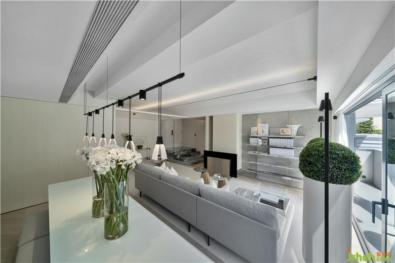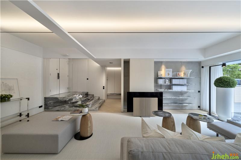 由庭院入户是打开这间用心之作的最佳选择,你可以发现Danny团队“小心思”里的“大布局”。设计师沿庭院中轴线灵活地运用了多组对称排列:中部由外至内对应布局两处休憩区,一块硕大的金色麻石一分为四,细节粗粝、香港别墅装饰沉稳而厚重,与之呼应的是庭院中央一方较小的实木矮凳,质感细腻、色厉而内荏;分立两侧的三组巨型花筒,一字排开,延伸入室,素白的超高桶身与葱郁的浑圆花球,柔和了此前矮凳尖锐的几何突触,并与粗点白麻石的地砖一起为户外空间奠定了素雅大气的色调氛围;