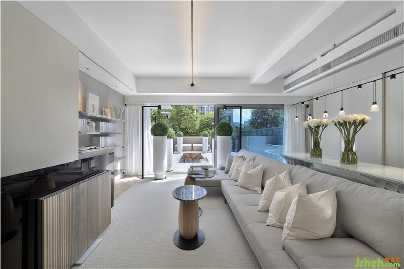 在房屋门楣挑高有限的情况下,设计师采取横向拓宽采光面积搭配全落地玻璃的方案,把充沛的自然光源与新鲜空气引入客厅,加强室内外空间联动;同时增加室内挑高,减低压迫感,香港别墅装饰配合入门处不加雕琢的水泥展示墙与全屋现代简约的素色装潢,整个空间熟稔亲切、干净自然。