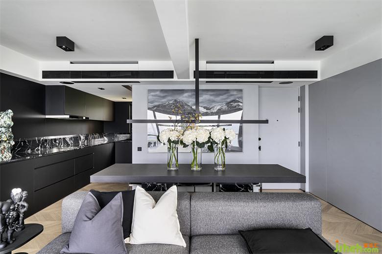 顺应空间的走势,香港私宅设计从定制的餐桌到矮背设计的灰色沙发,可升降的B&O品牌电视等,不失美感也避免遮挡观景视线,无论是日常宅家还是朋友聚餐,都能将辽阔的大海景色尽收眼底,创造轻松自由、多元互动的空间体验。