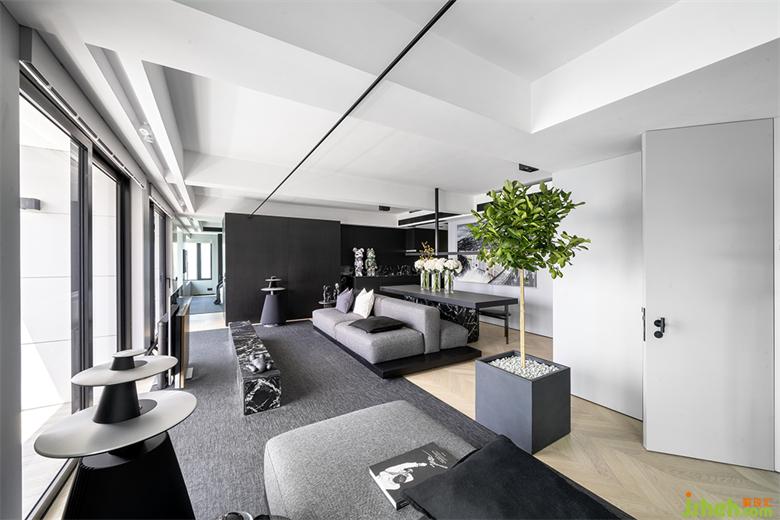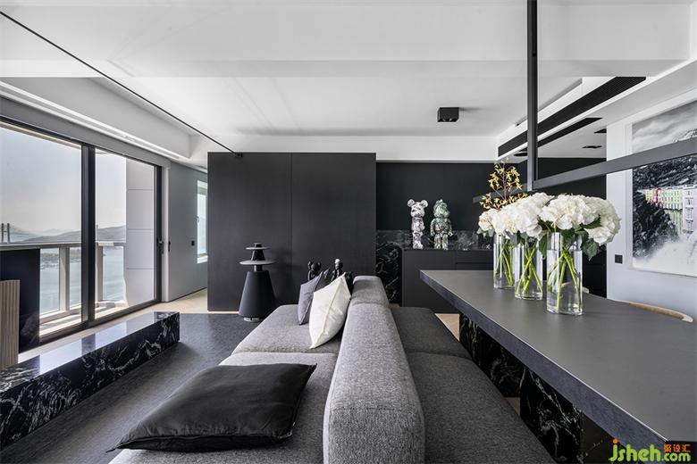 空间主基调为黑白灰,形成强烈的视觉冲击,香港私宅设计为了平衡黑色的大面积运用可能产生的压抑感与负面情绪,通过绿色植物与鲜花的细节点缀,打破沉闷,生长出自然的呼吸感和治愈的力量。
