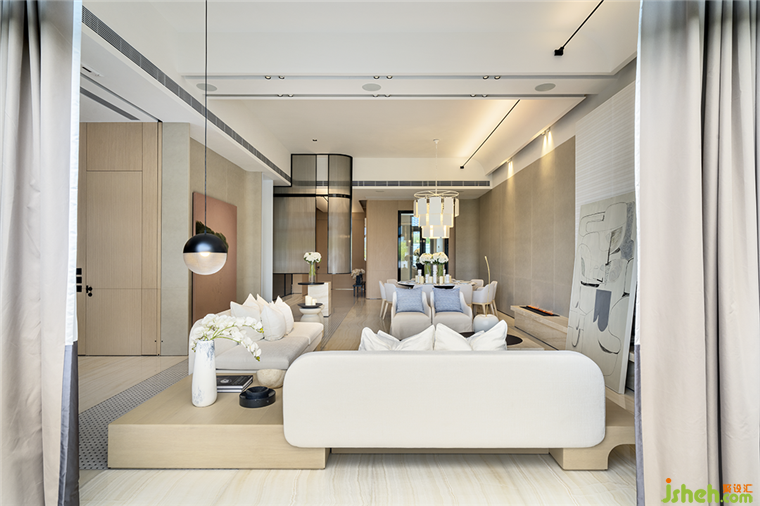 一盏白色薄片金属整齐排列的吊灯以优雅别致的魅力成为餐厅主角;别墅装修设计车线卡其色人造皮及浅色木饰面的大面积导入,尽显温暖简约的居住氛围。