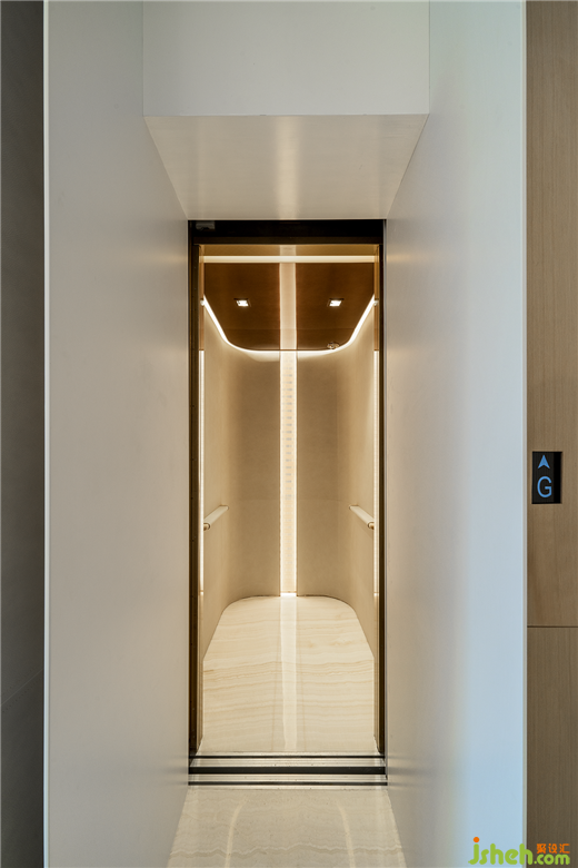 别墅装修设计弧形半通透玻璃吊屏风巧妙设置于入口走廊,呼应着空间局部的弧形线条,灵巧无声的光线穿透屏风形成游移。线形装饰灯贯穿于每个空间,既有功能性亦加强空间的线条美与韵律感。