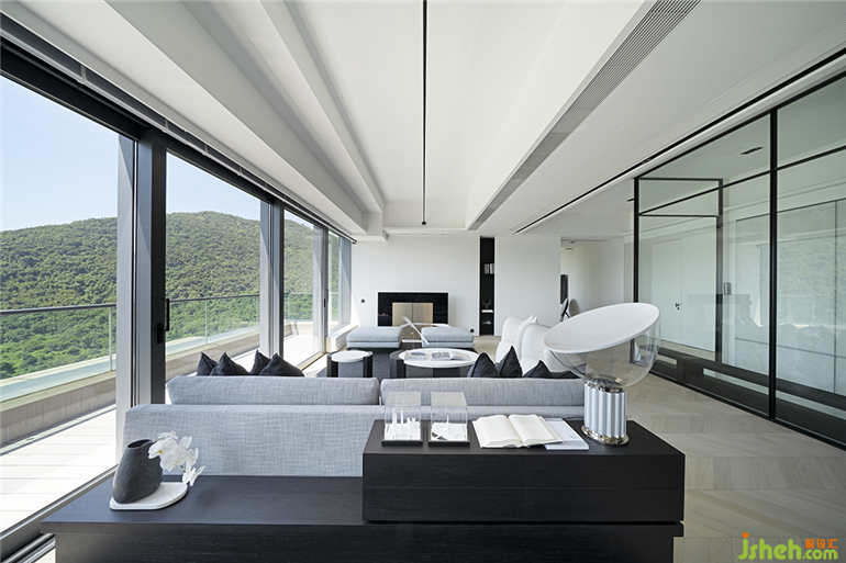 横向超长的客厅,因地制宜,全落地玻璃窗提供了直接的视野,香港私宅设计打破内外界限,不经意间将室外的自然光线与满山黛绿引入室内,放眼之处,尽是壮丽的自然风景。在潜移默化的全开放的空间氛围中,外界的纷扰嘈杂,慢慢代谢消解,直至烟消云散。