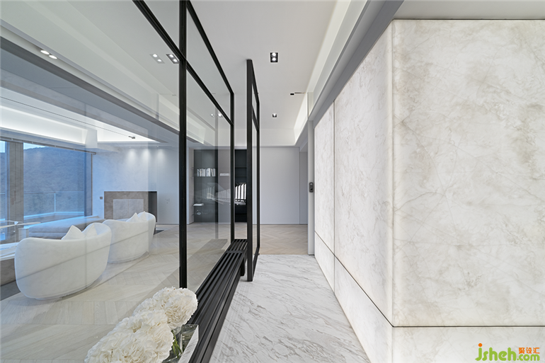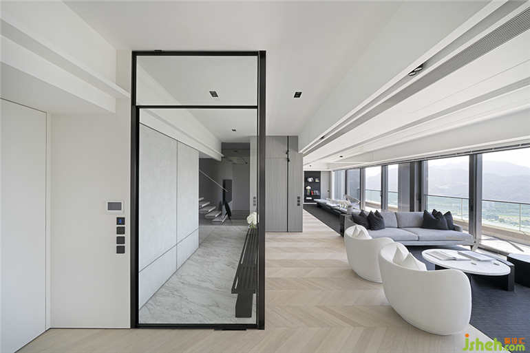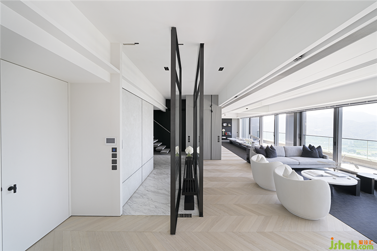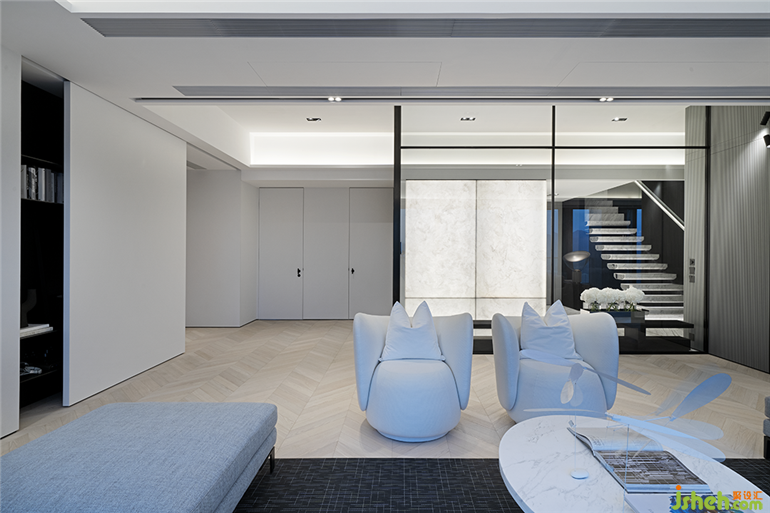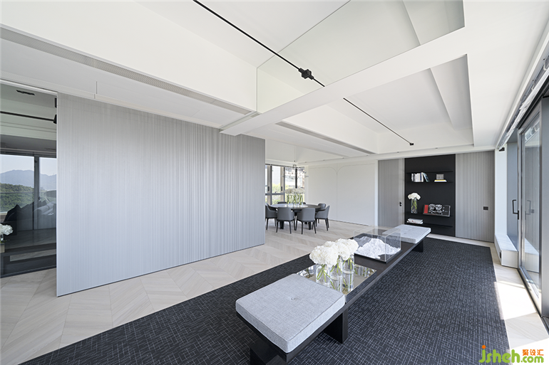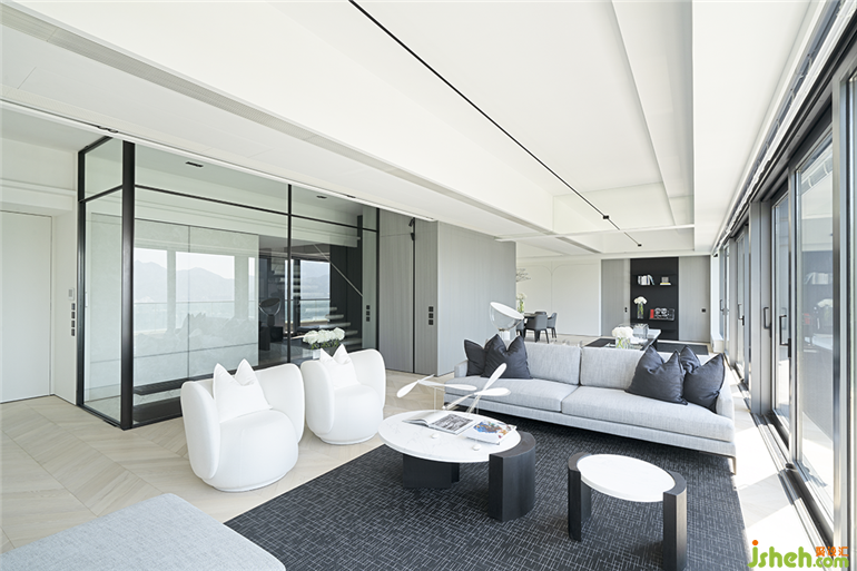 全开放的自由空间,开合有序,结合低调明快的现代元素的家居陈设,黑白灰的色彩组合比例恰到好处,精心设计的家具摆放位置形成自然的边界划分,与天花的线性系统灯具上下平行,加深了视觉延伸感与流动感,香港私宅设计塑造深邃宁静且轻盈通透的空间调性。