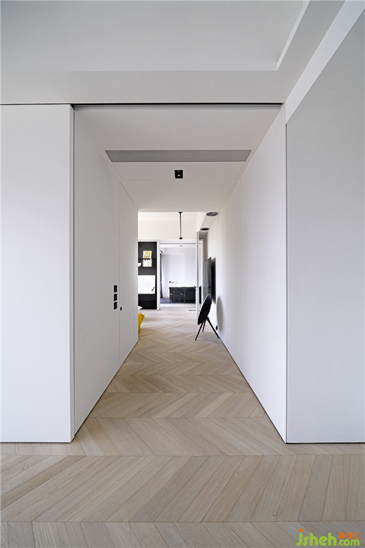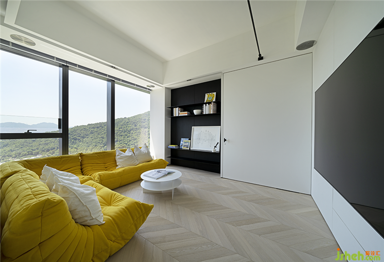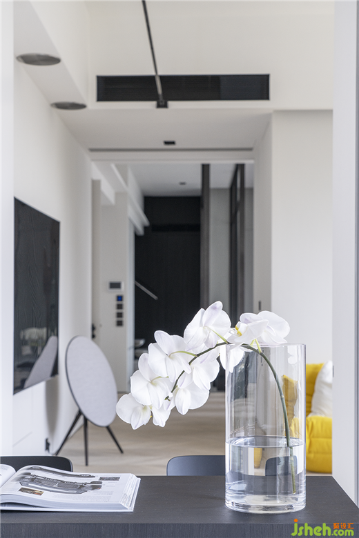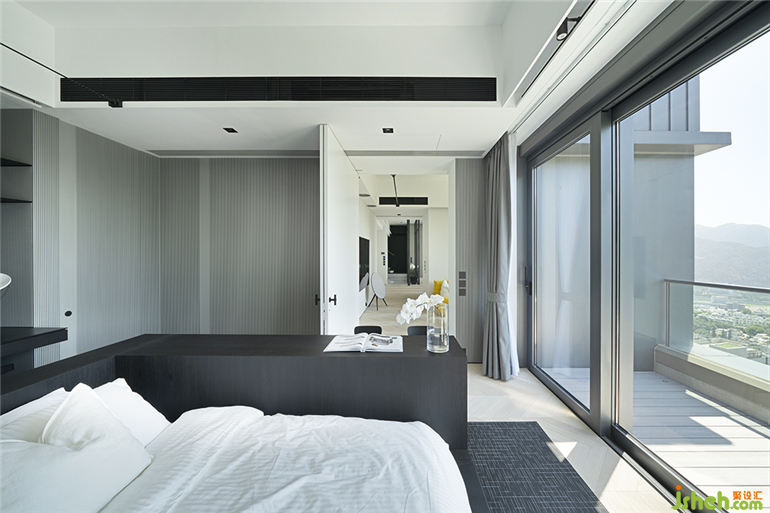 从公共区域通往两端的私人休憩区域,情景转换的节奏和秩序悄然发生变化。卧室前的小型私人空间,可开可合,适合一人独自安静阅读或观赏喜爱的电影,沉浸于自我向内探求的私享时光。