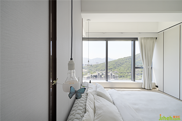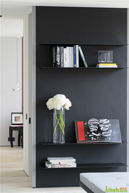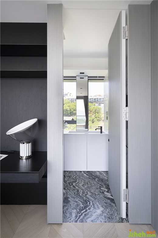 两间卧室套房分别位于客厅两端,均配置独立卫浴,充分考虑私密性的需求,家庭成员之间互不干扰。香港私宅设计整体的动静布局充满巧思,无形中提升了空间的原始优势,无需堆砌太多装饰的物件与焦点,整体视觉以不同层次的黑白素色为主,自然光与自然景色的无限涌入,便是最好的艺术品,抬眼间便是一幅优美的风景画。